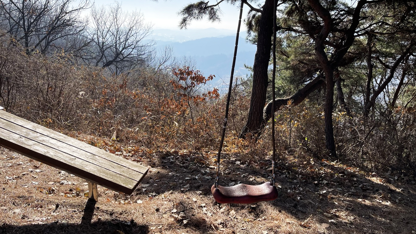 놀이터에서 흔히 볼 수 있는 그네를 산 속에서 보니 뭔가 특별한 이야기가 있을 것 같아 궁금증이 생깁니다.ㅎ