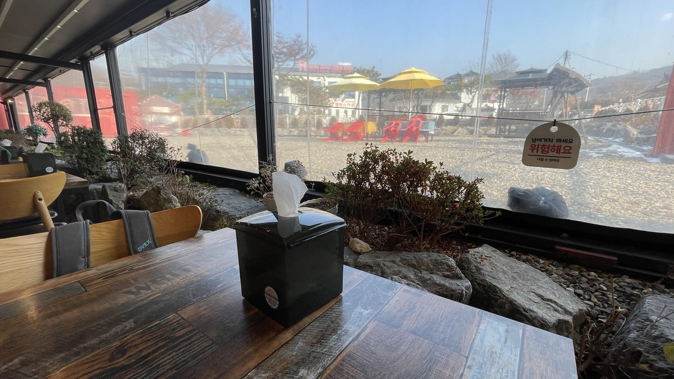 테이블 옆으로 화단도 있고 창이 넓어 개방감이 있어요. 은근 캠핑 나온 기분이 듭니다.