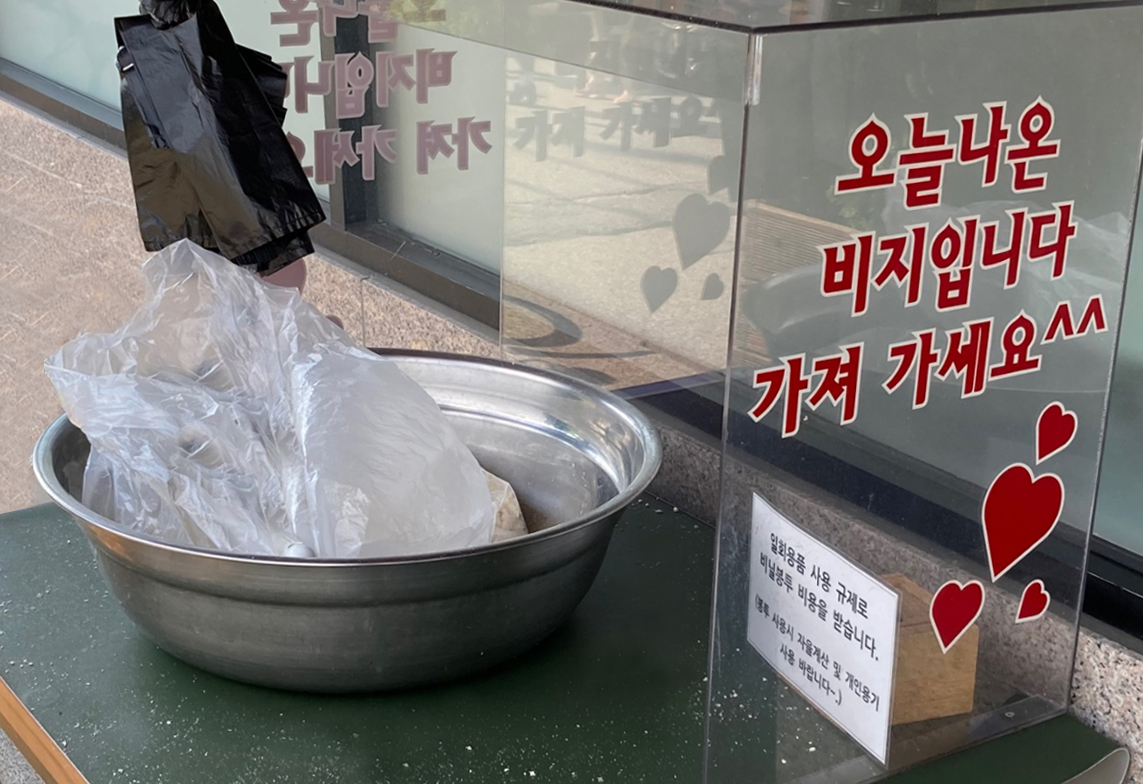 식당 입구 앞에는 오늘 나온 비지가 놓여 있습니다. 무료 서비스에요~