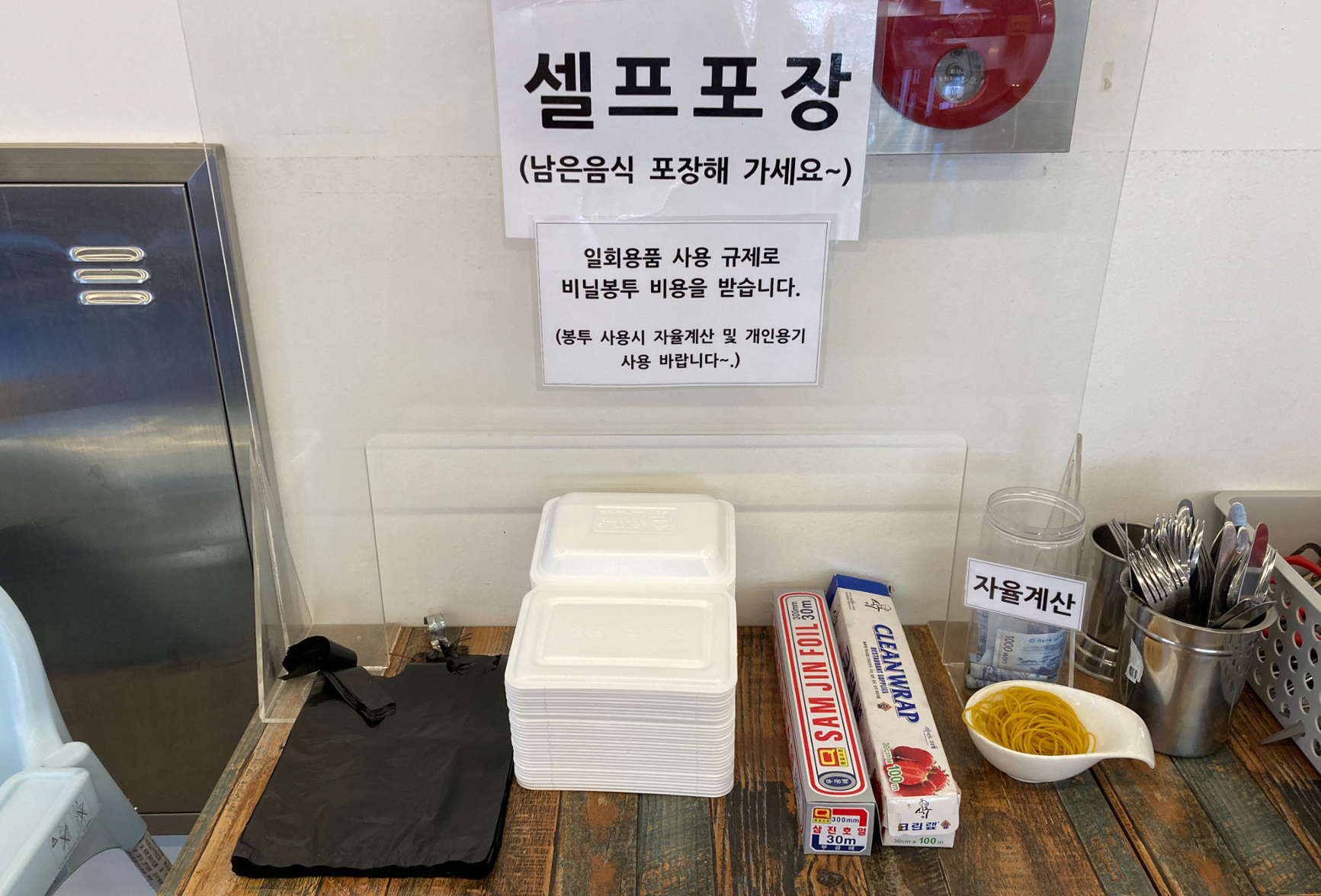 물, 집게, 가위, 국자 등은 셀프코너에 마련되어 있고, 먹다가 남은 음식은 셀프 포장해서 가져갈 수 있습니다.