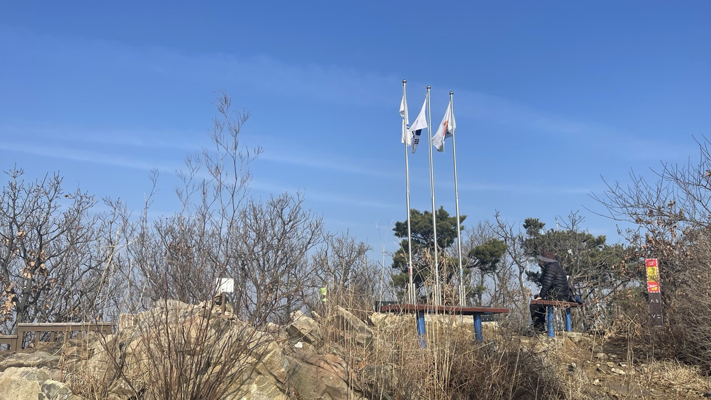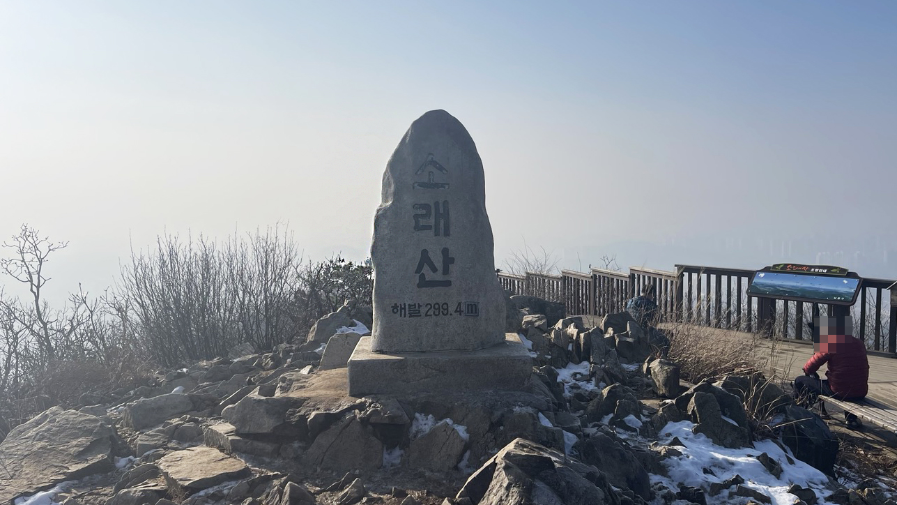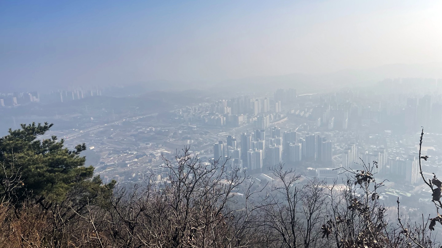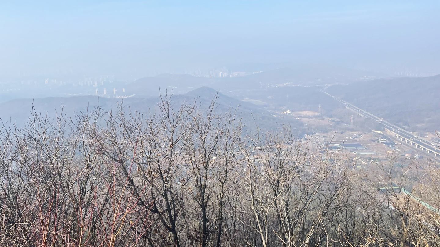 이 날은 미세먼지가 심한 날이라 시야가 좋지 않았어요; 산 아래가 뿌옇게 흐려있어 마치 목에 가래 낀 것마냥 답답한 풍경이었습니다. 정상에 딱 도착했을 때 확 트인 시야로 멋있는 경치가 펼쳐져야 피로가 확 풀리는데 말이에요ㅠㅠ
