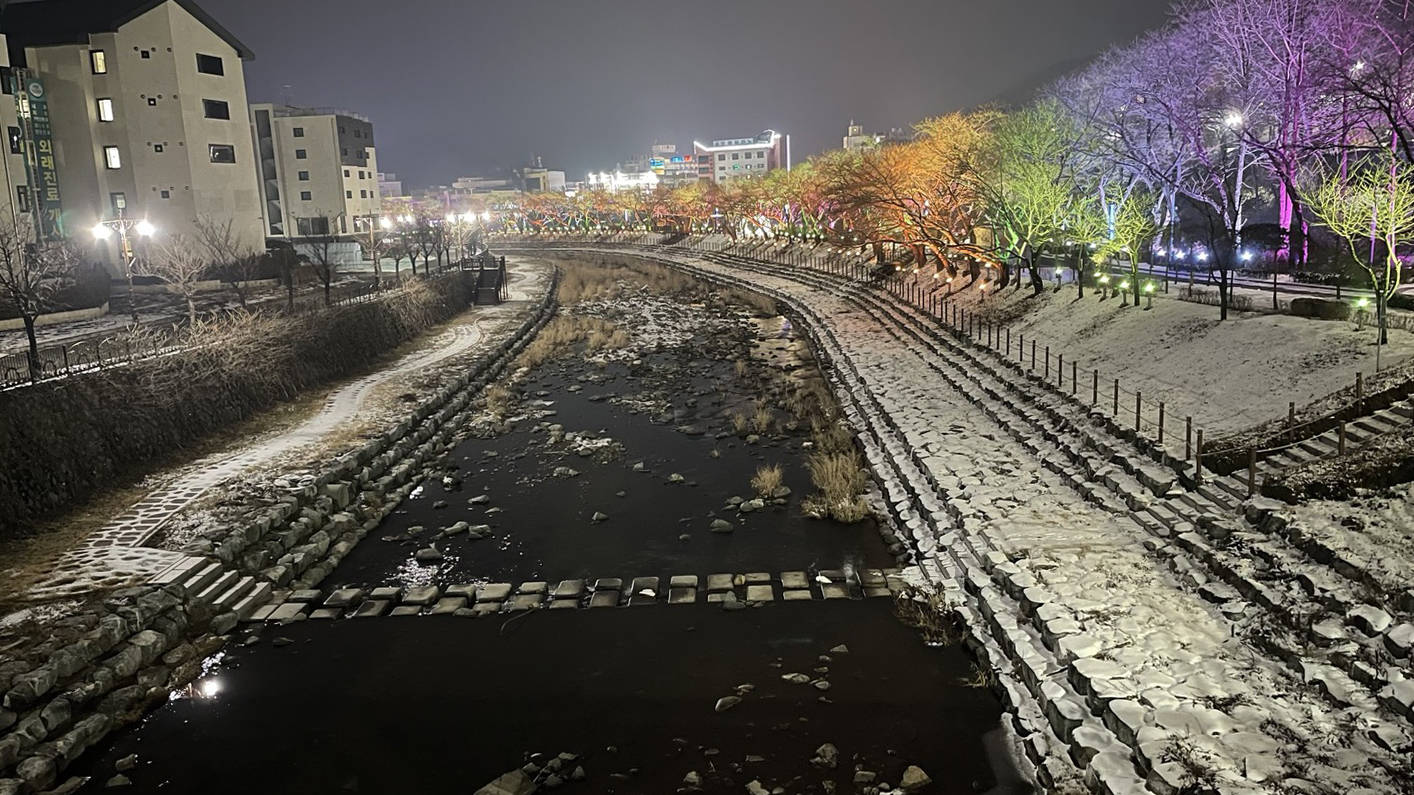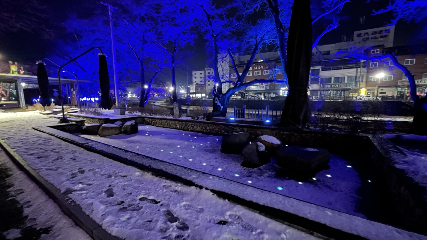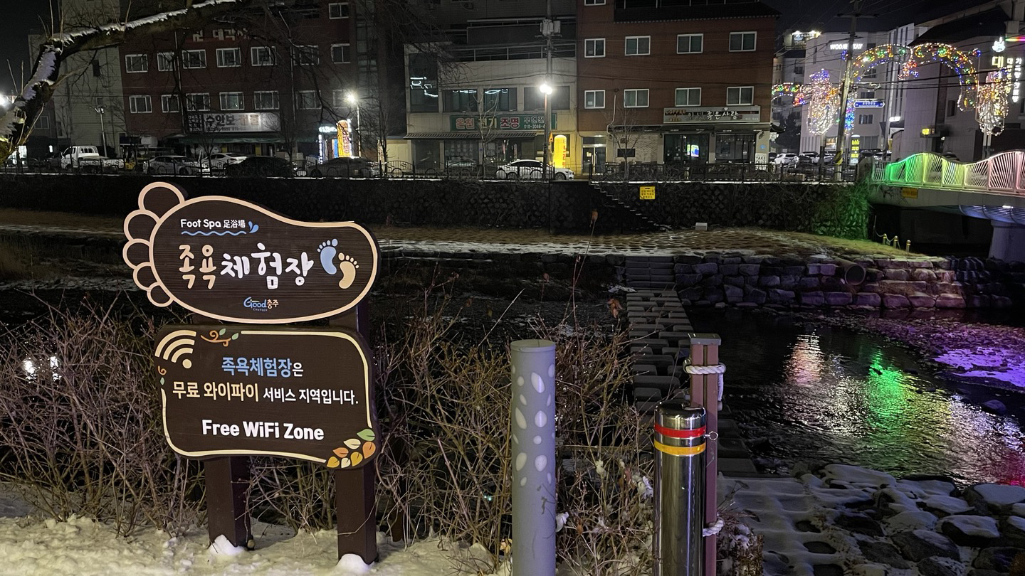 '석문동천'이라는 하천을 따라 조성되어 있는 족욕길은 무지개빛 조명이 켜져있어 꽤나 정취있고 걷기에도 좋았어요.