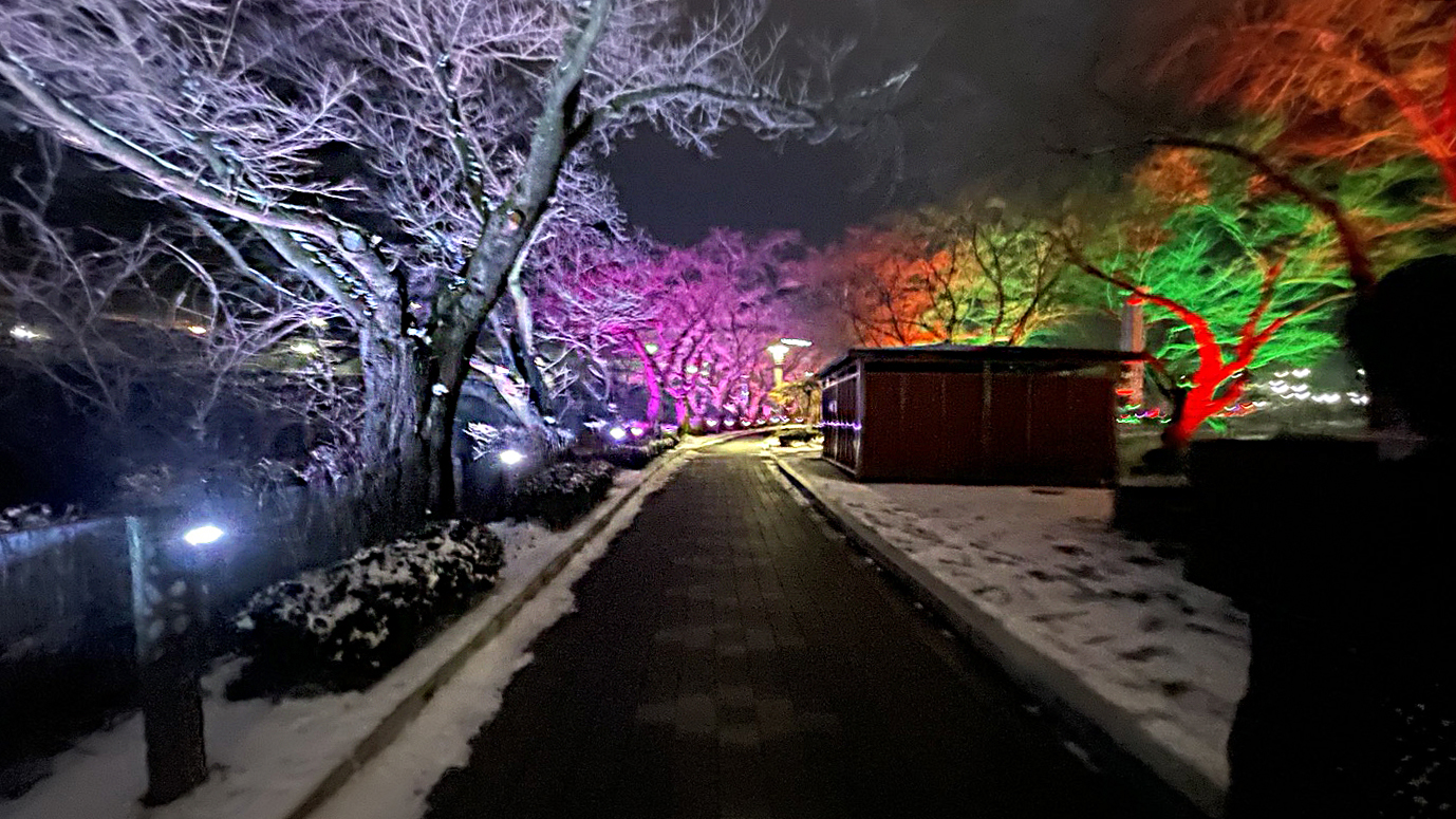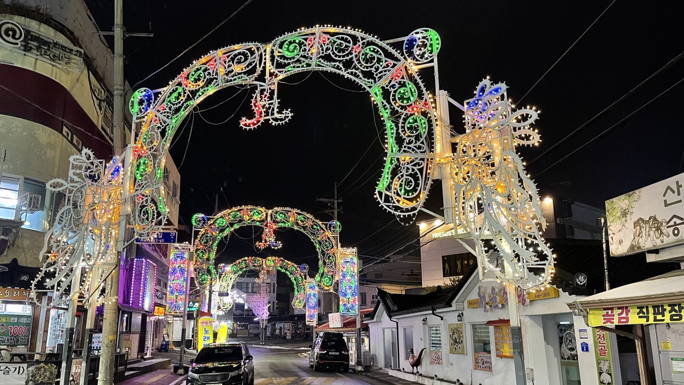 밤이 되니 화려한 조명등이 거리를 장식하고 있었어요.