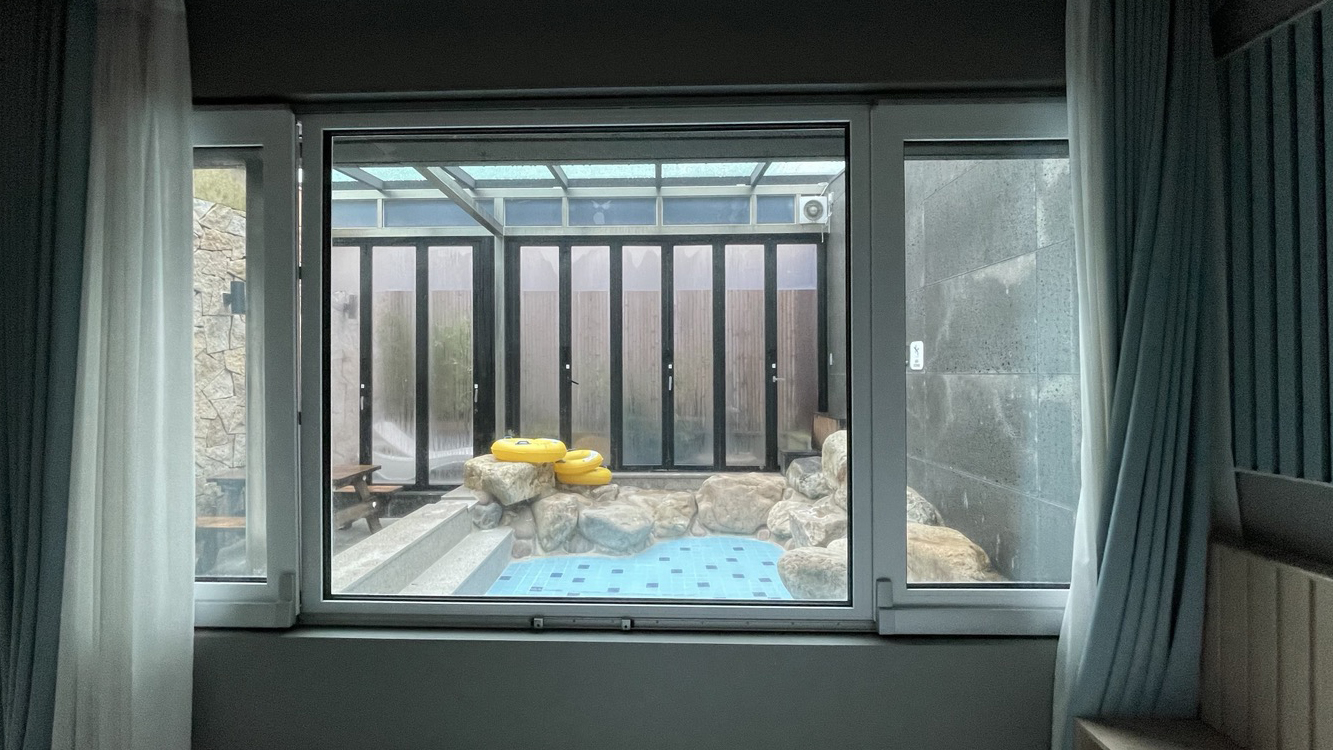 침대 옆에 난 큰 창으로 온천탕이 바로 보여서 어린 자녀들과 온천욕 즐길 때 더욱 안심할 수 있겠어요.