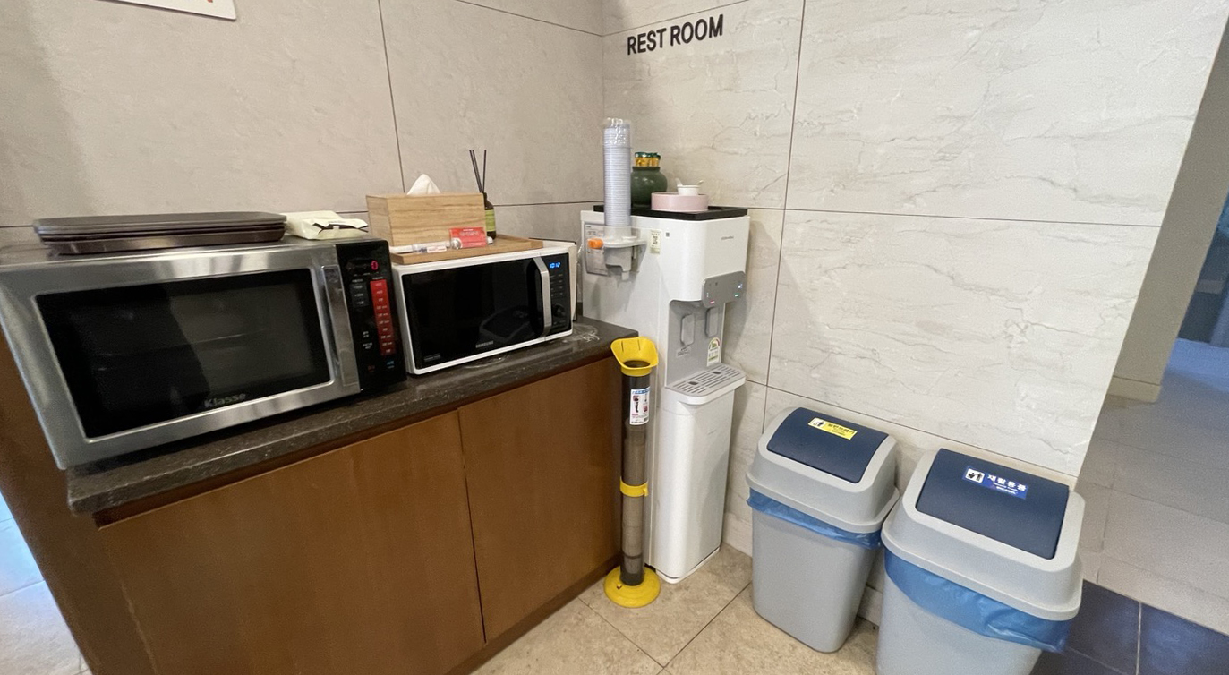 휴게실 옆으로 정수기와 전자렌지가 비치되어 있고요.