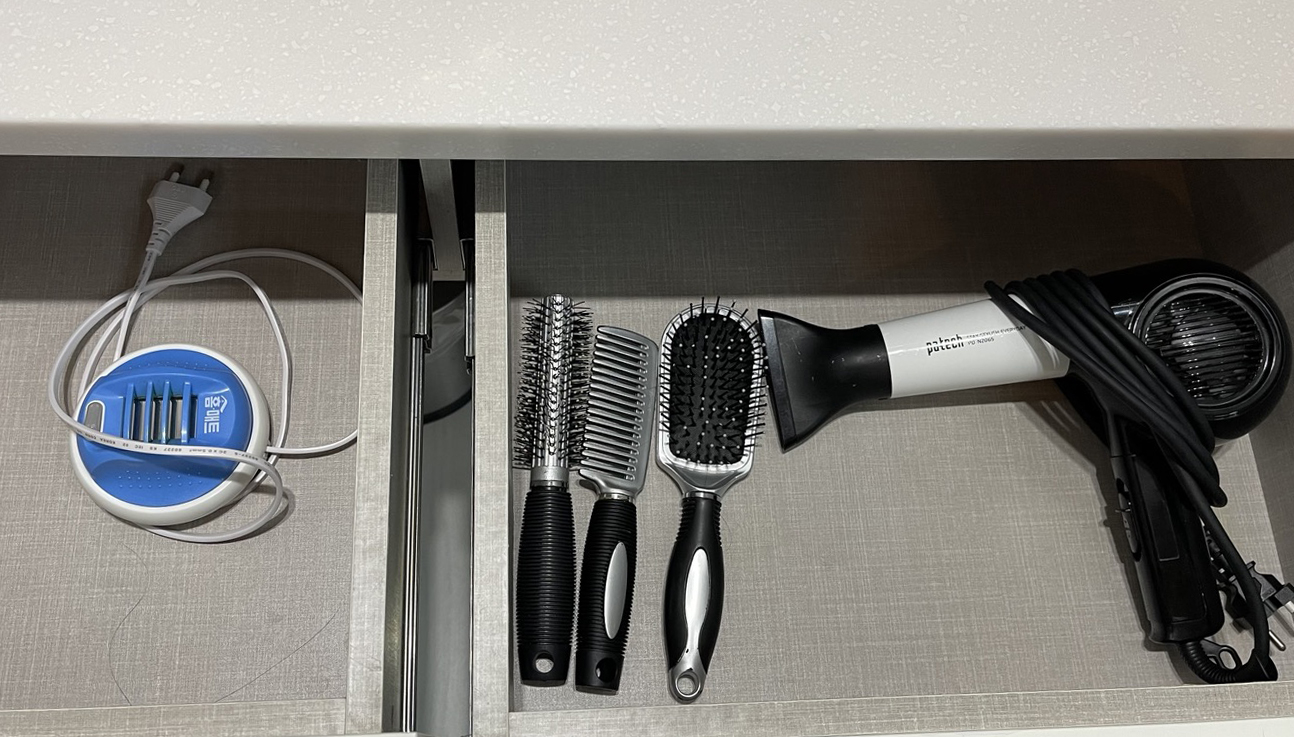 깨끗한 수건과 스킨/로션, 세면용품들이 들어있는 파우치, 빗과 드라이기 등이 준비되어 있습니다.