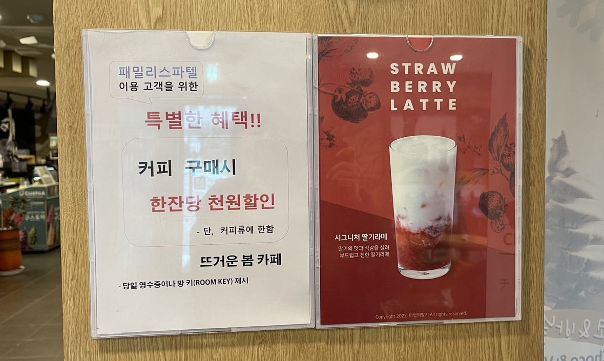 패밀리스파텔 1층 휴게실 옆으로 카페가 연결되어 있어 카페 이용도 용이합니다.