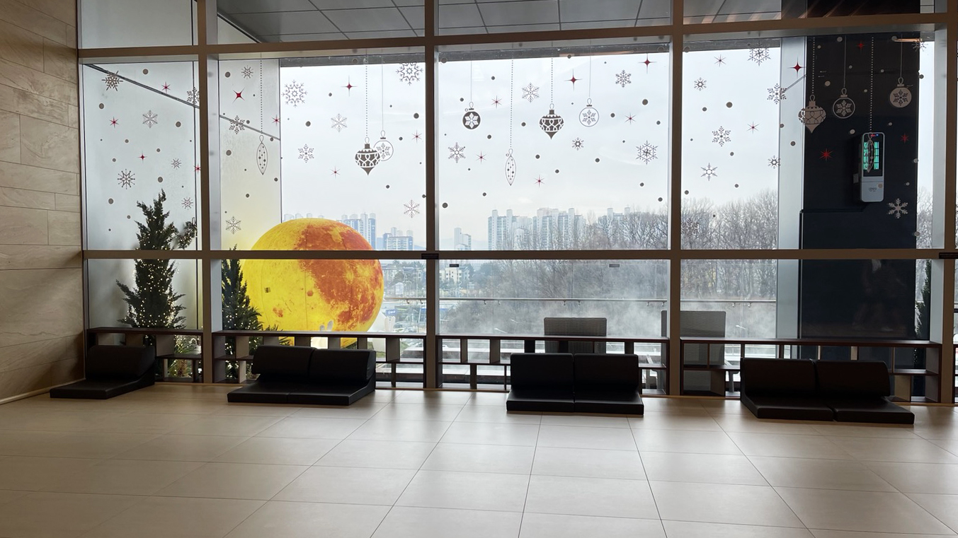 아쿠아필드 안성 로비 모습입니다. 중앙에 실내 워터파크 시설이 보이네요.
