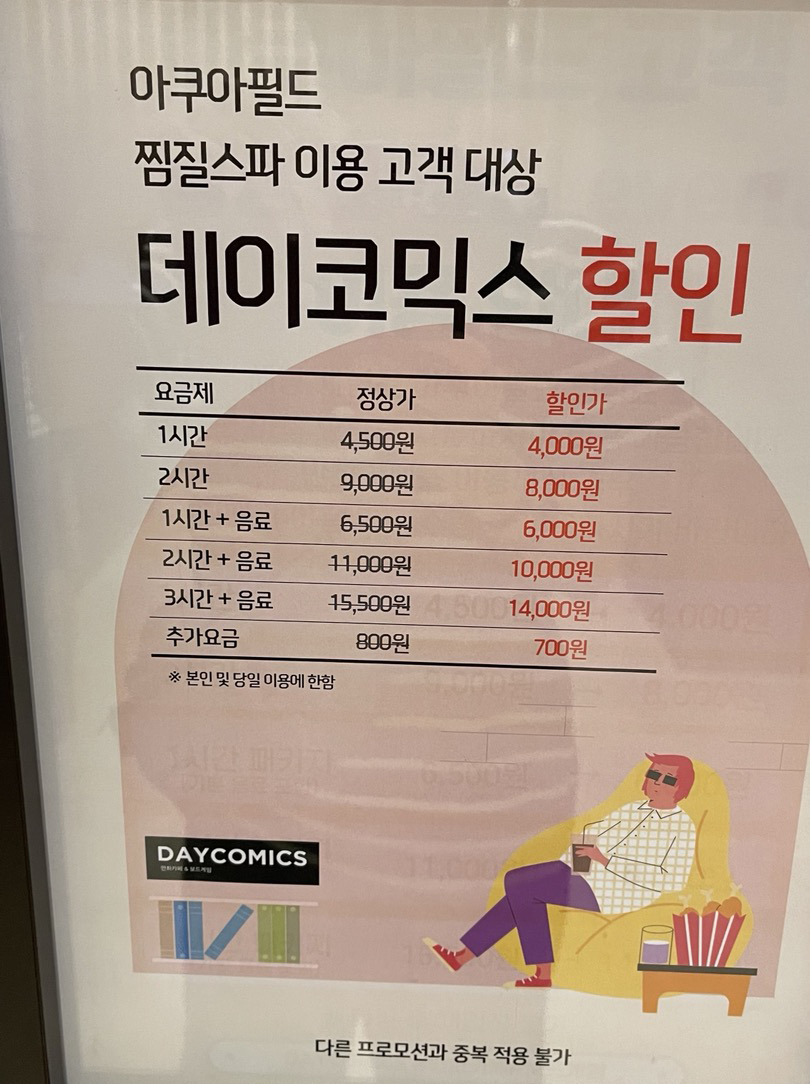방문객 중 아이들 비중은 유아들이 많아요. 방학기간인데도 초등생 이상은 잘 보이지 않더라고요. 아마도 키즈룸 입장에 제한이 있고, 찜질이나 풋스파를 즐기는 것 외에 즐길거리가 많지 않기 때문인것 같아요. 가만히 누워있는걸 별로 즐기지 않는 저도 2시간 정도 지나니 슬슬 지겨워지려고 하더라고요^^;