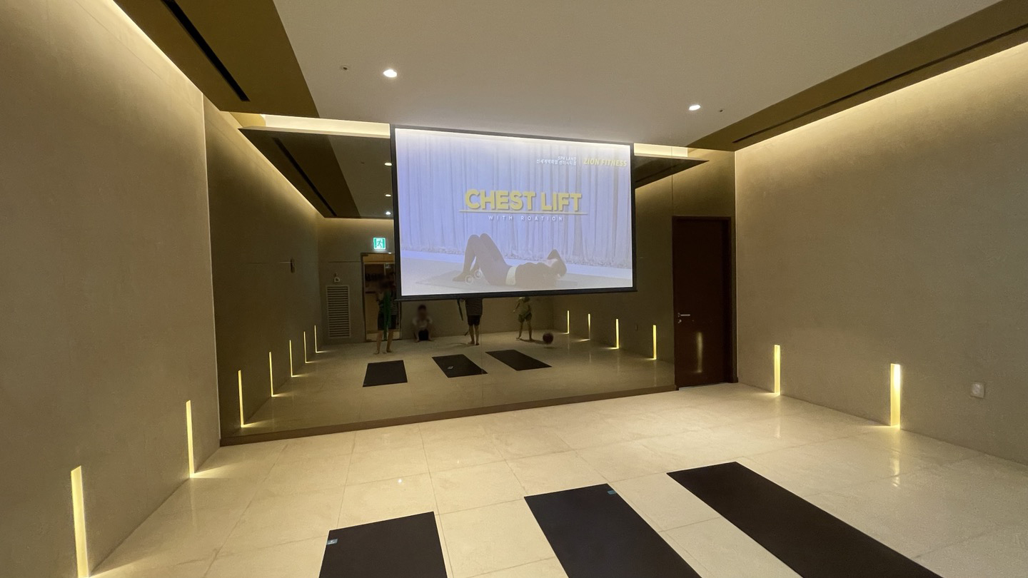 다양한 운동도구들이 준비되어 있고요. 한쪽 벽면에는 요가영상이 반복되어 재생되고 있습니다.