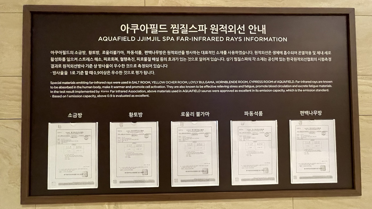 아쿠아필드 안성의 소금방, 황토방, 로울리불가마, 파동석룸, 편백나무방은 원적외선을 방사하는 대표적인 소재를 사용했다고 합니다. 원적외석은 생체에 흡수되어 온열작용 및 체내 세포 활성화를 일으켜 스트레스 해소, 피로회복, 혈행촉진, 피로물질 배설 등의 효과가 있는 것으로 알려져 있습니다.