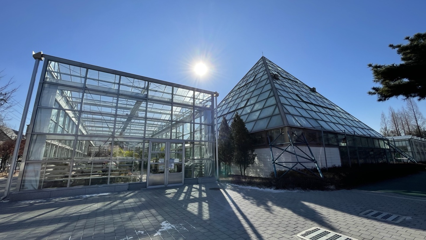 피라미드 모양의 온실과 육면체 모양의 온실이 연결되어 있습니다.