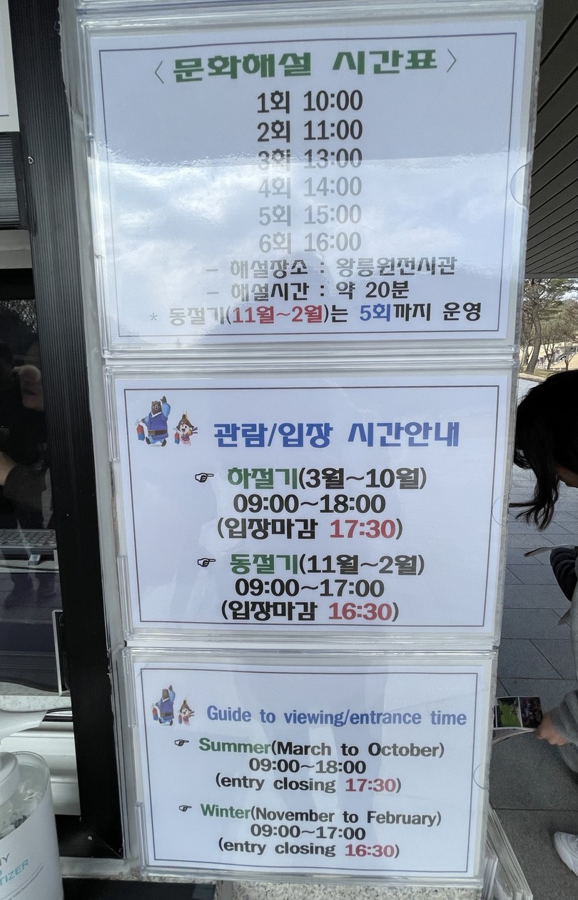 운영시간 : 하절기(3월~10월) 9:00~18:00, 동절기(11월~2월) 9:00~17:00 (종료 30분전까지 입장)