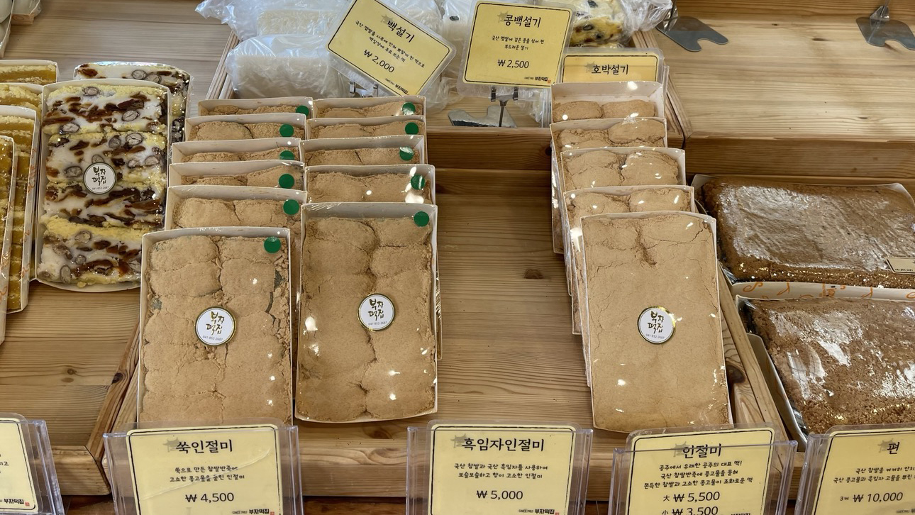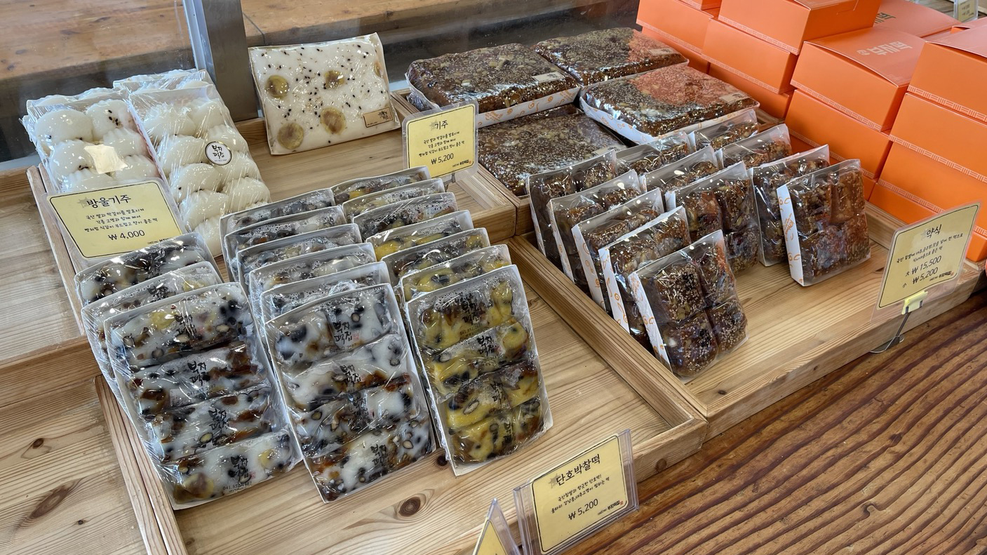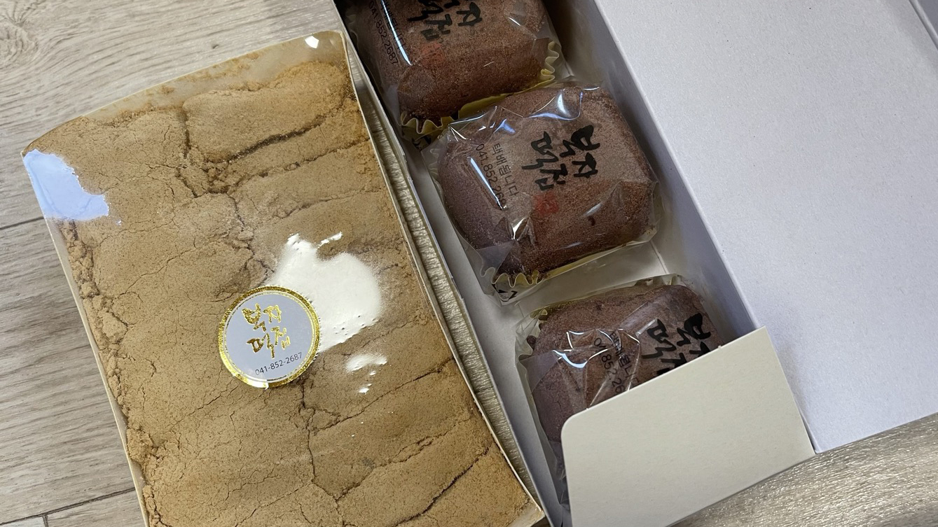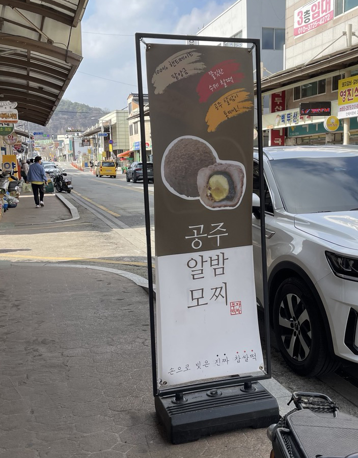 인절미의 고장에 왔으니만큼 고소한 냄새 솔솔 풍기는 인절미 하나 먼저 담고~ 큰 알밤이 통째로 들어가 있는 공주알밤모찌도 하나 샀습니다.