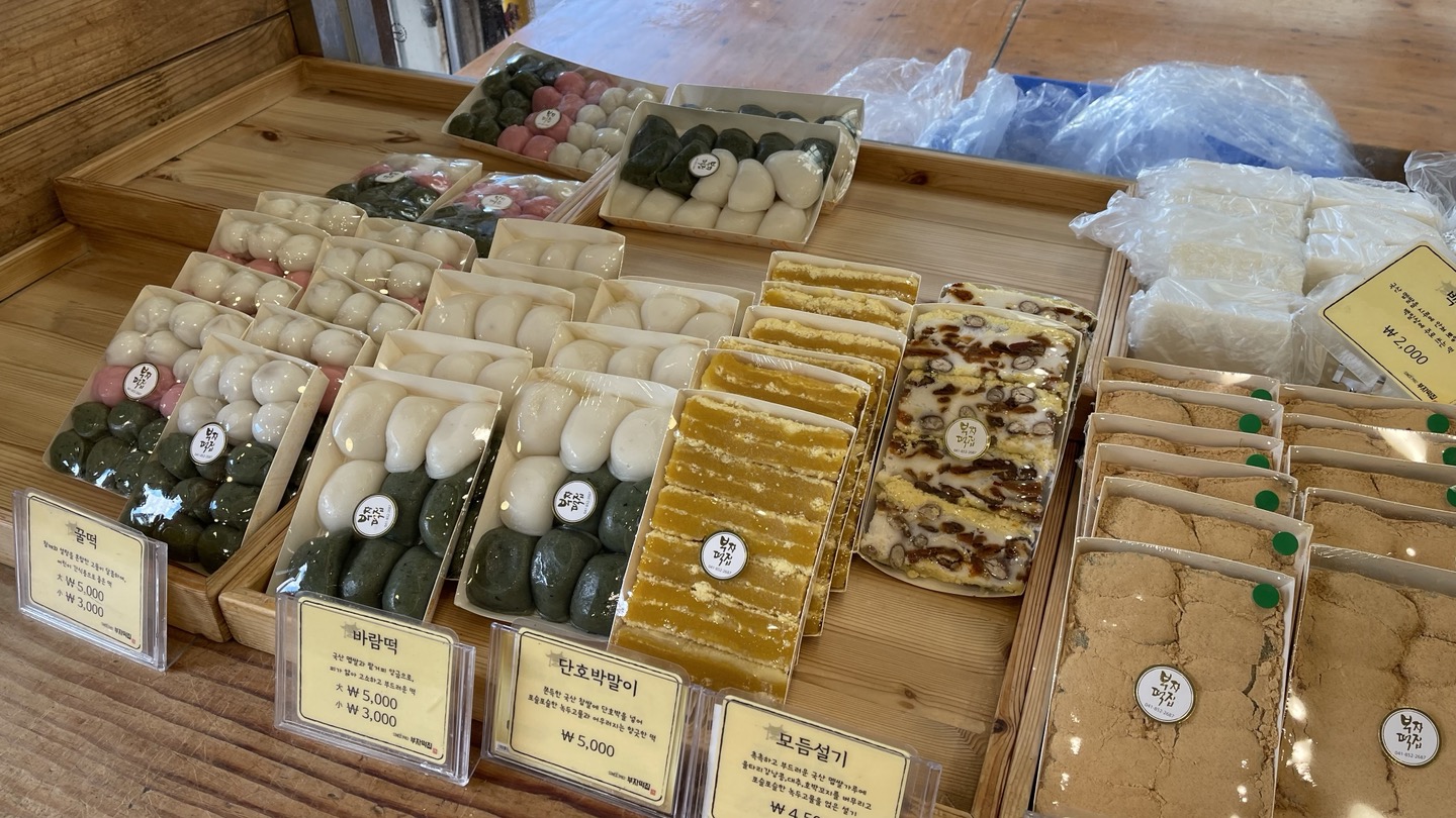 다양한 떡들이 진열되어 있습니다.