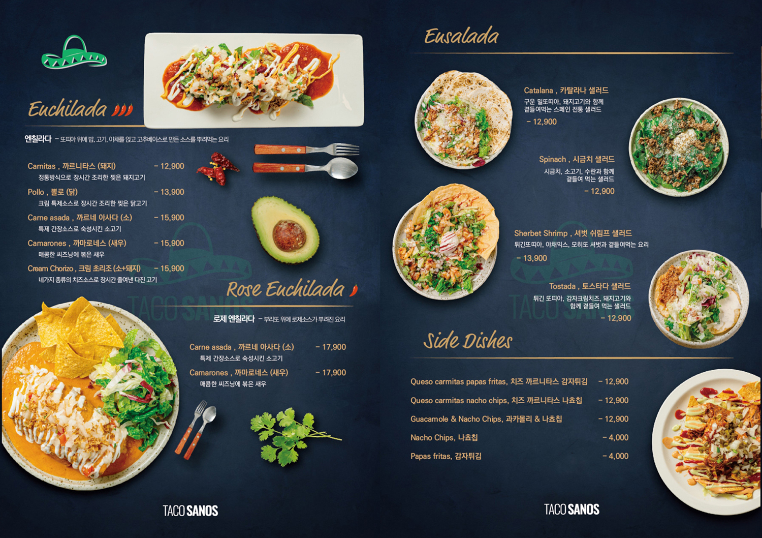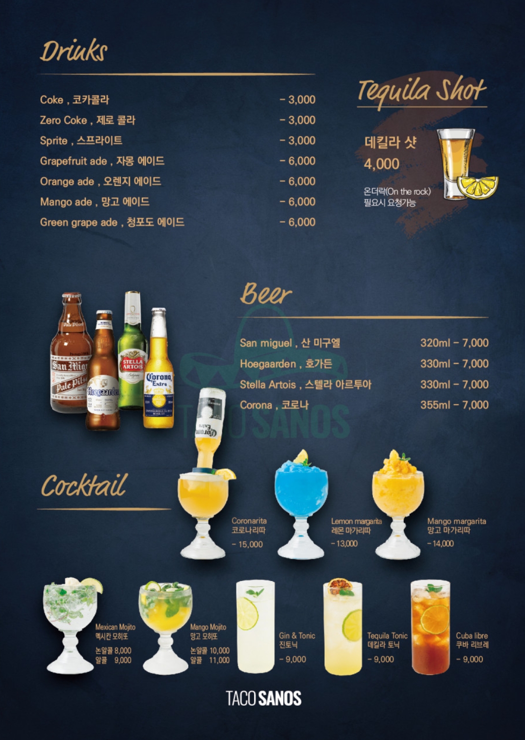 타코사노스 메뉴입니다. 다양한 메뉴로 구성되어 있습니다.