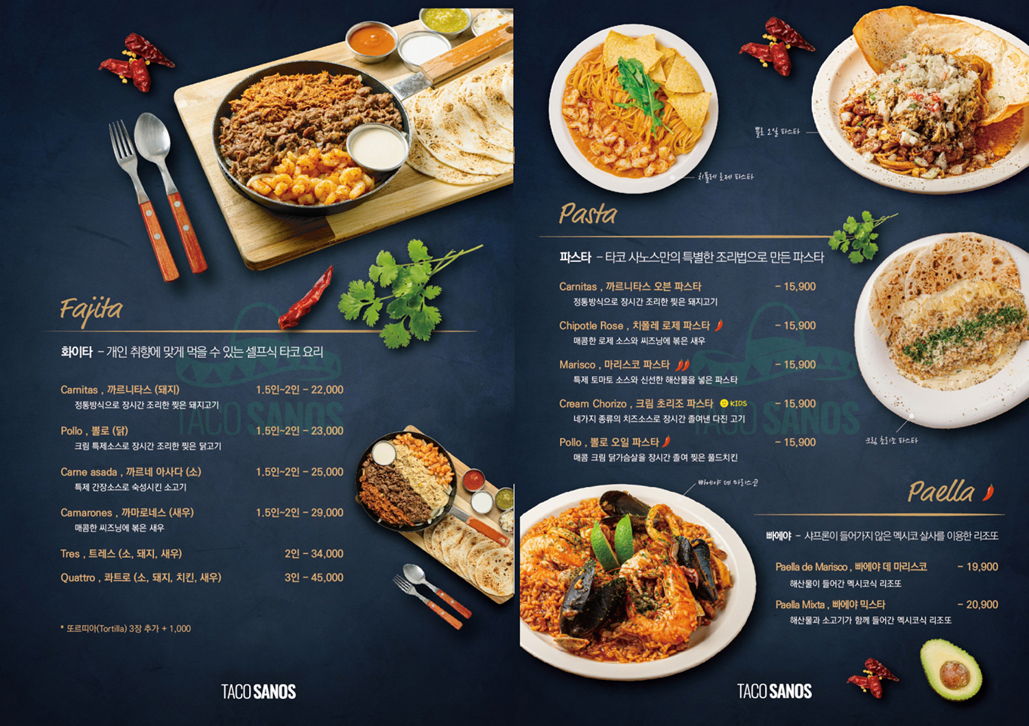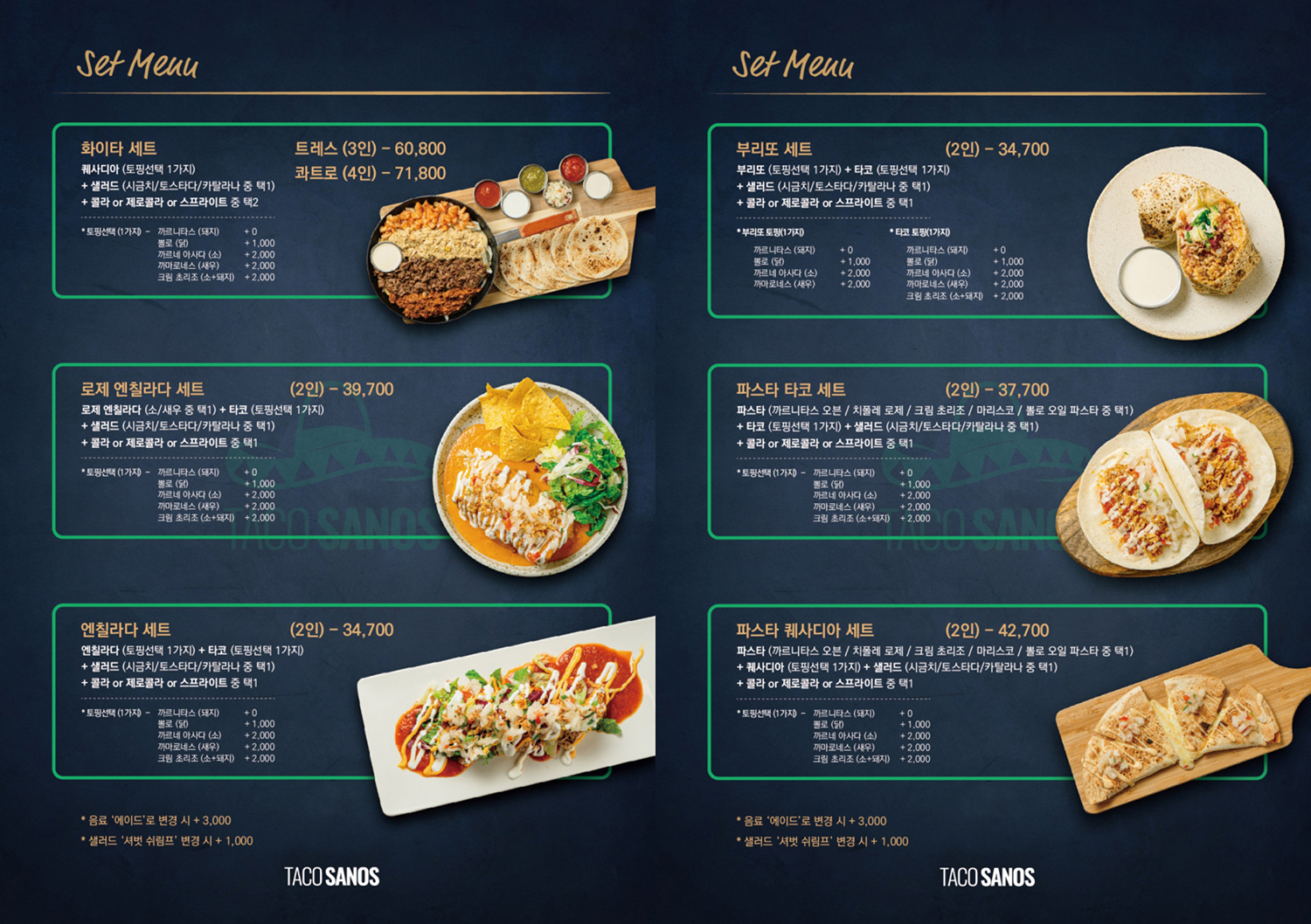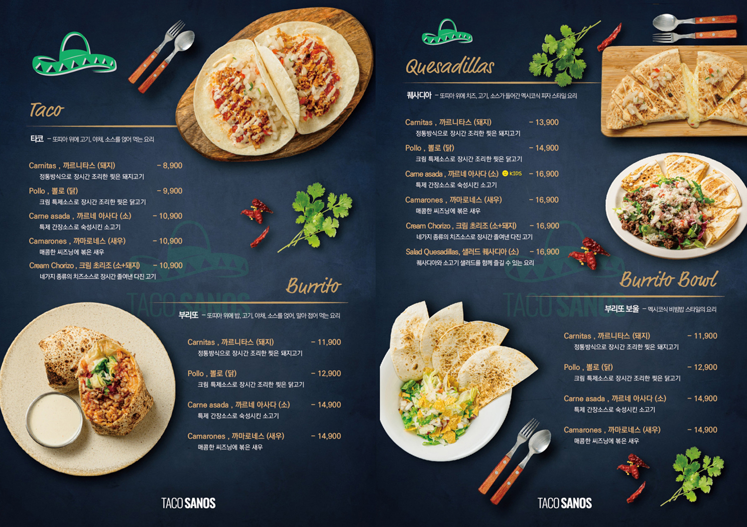 타코사노스 메뉴입니다. 다양한 메뉴로 구성되어 있습니다.