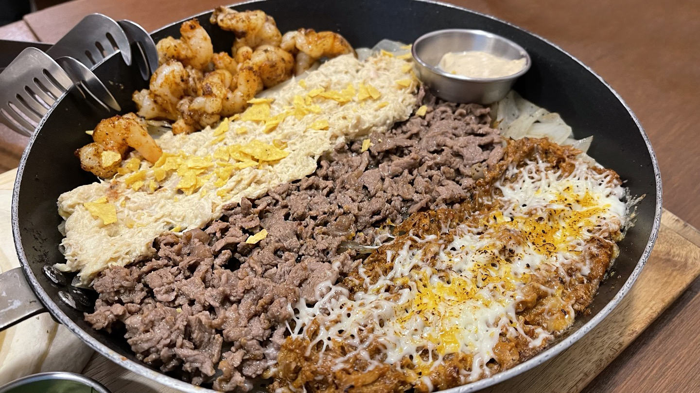 소고기, 돼지고기, 닭고기, 새우로 구성된 육류 요리가 나옵니다.