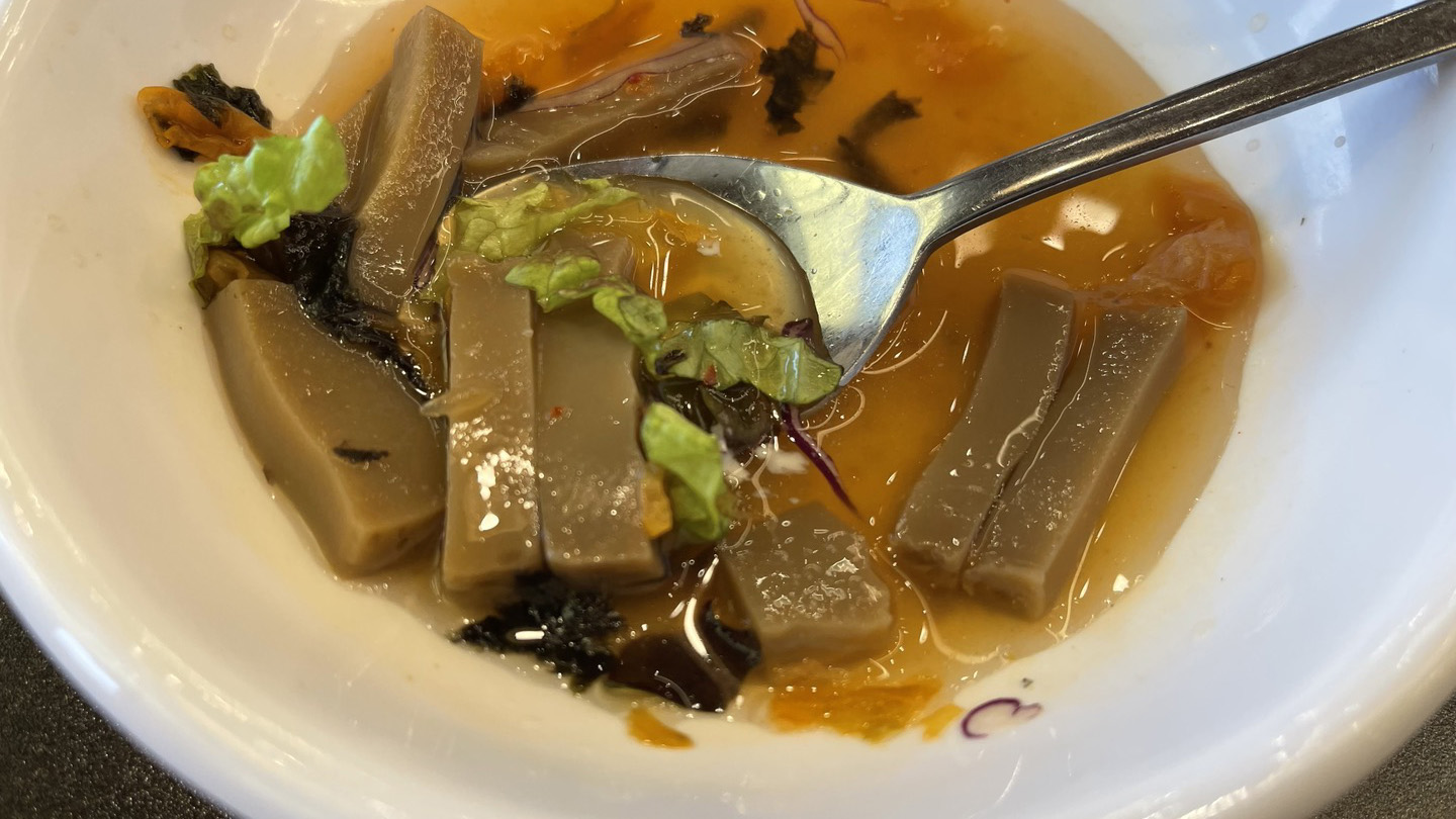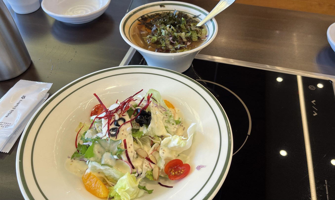 기본으로 나오는 채소샐러드와 묵사발, 밑반찬들이에요.