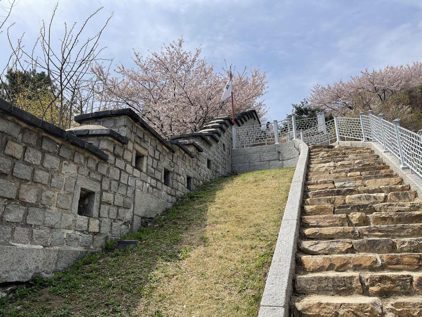 서남암문에서 서장대로 향하는 성곽길은 벚꽃과 소나무가 어우려져 있습니다. 우아함과 강직함이 묘하게 섞여있는 느낌이 너무 좋더라고요 .