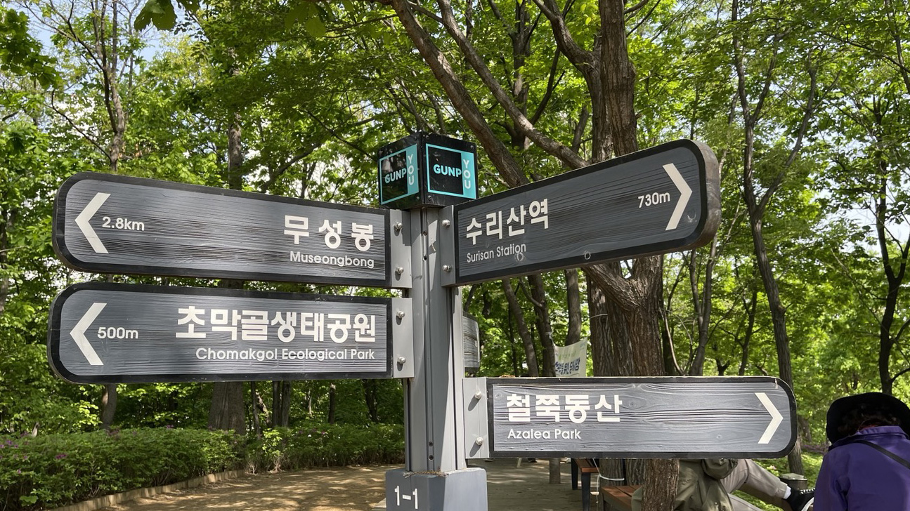 계단 끝에 이정표가 있습니다. 무성봉, 초막골생태공원, 수리산역 등과 연결되어 있어요.