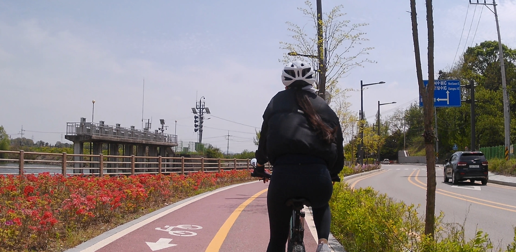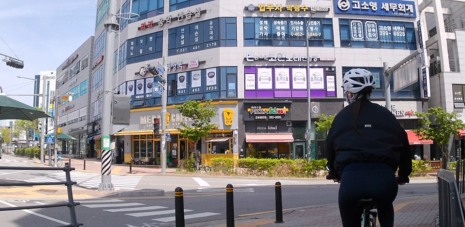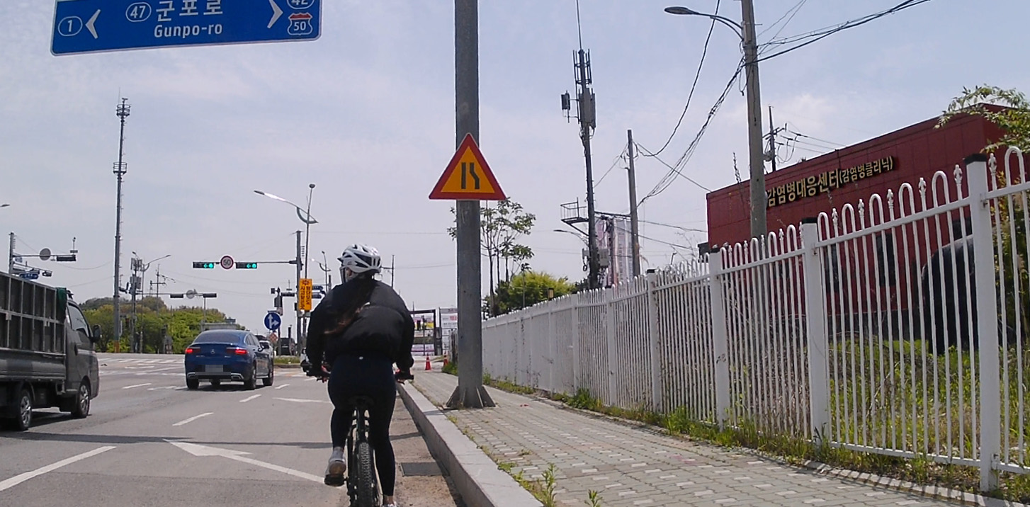 여기서부터 피곤이 급격히 누적됐어요;; 아무래도 횡단보도가 많은 점, 자전거와 인도가 겸용인 길을 사람들을 피해 조심조심 다녀야 하는 상황이 겹쳐서 그런 것 같아요. 아직 공도 주행은 두렵고... 도심 주행은 저에겐 여러모로 힘든 것 같아요.ㅜㅜ