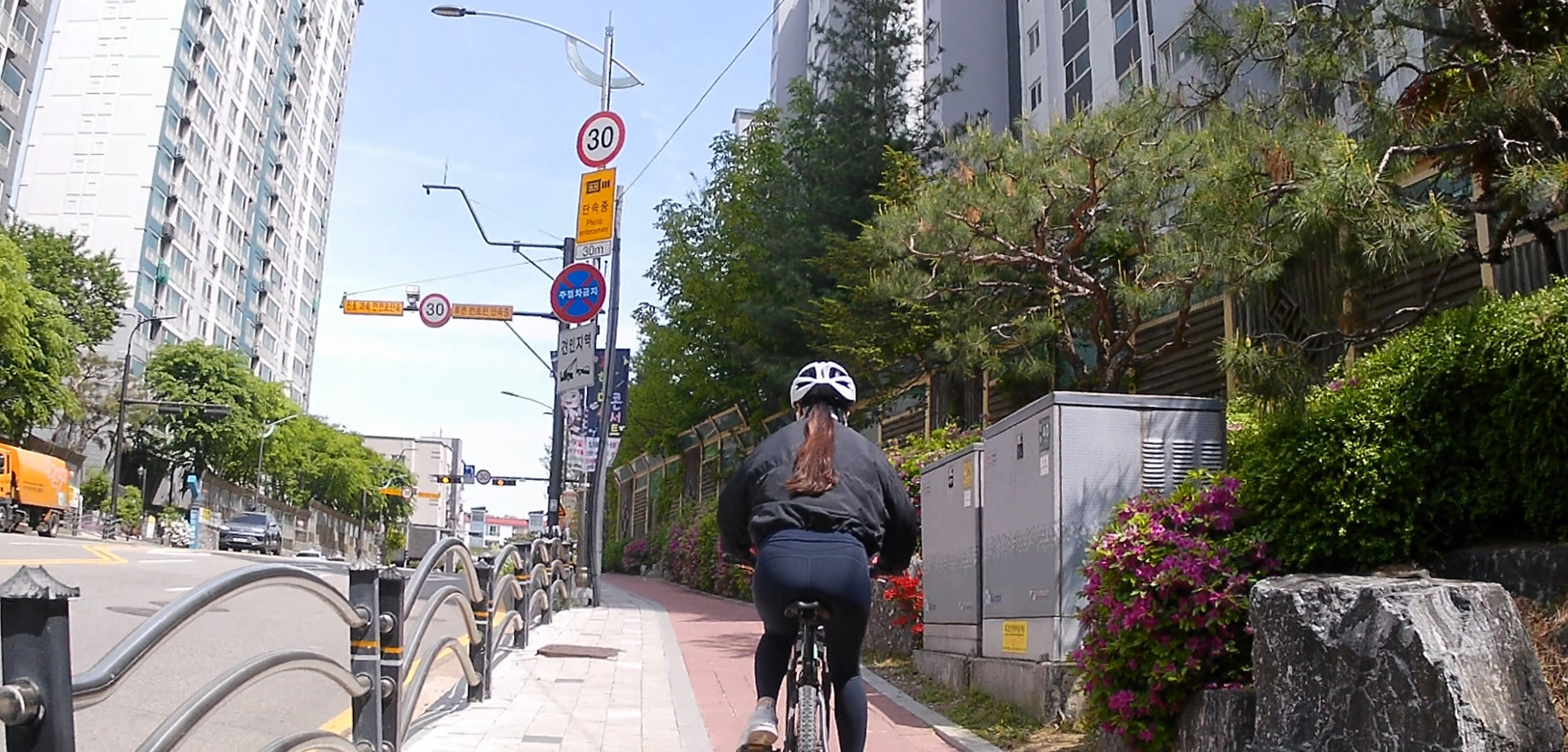 고도가 낮은 쪽 길은 업힐 구간이 완만하고 짧아서 큰 무리없이 갈 수 있었습니다. 도심을 통과하는 길이다 보니 자전거도로가 잘 되어 있어 편하게 갈 수 있지만 횡단보도가 너무 많았어요;; 조금 가다 신호등, 조금 가다 또 신호등... 가다 서다 하니 그게 더 맥이 빠졌습니다.