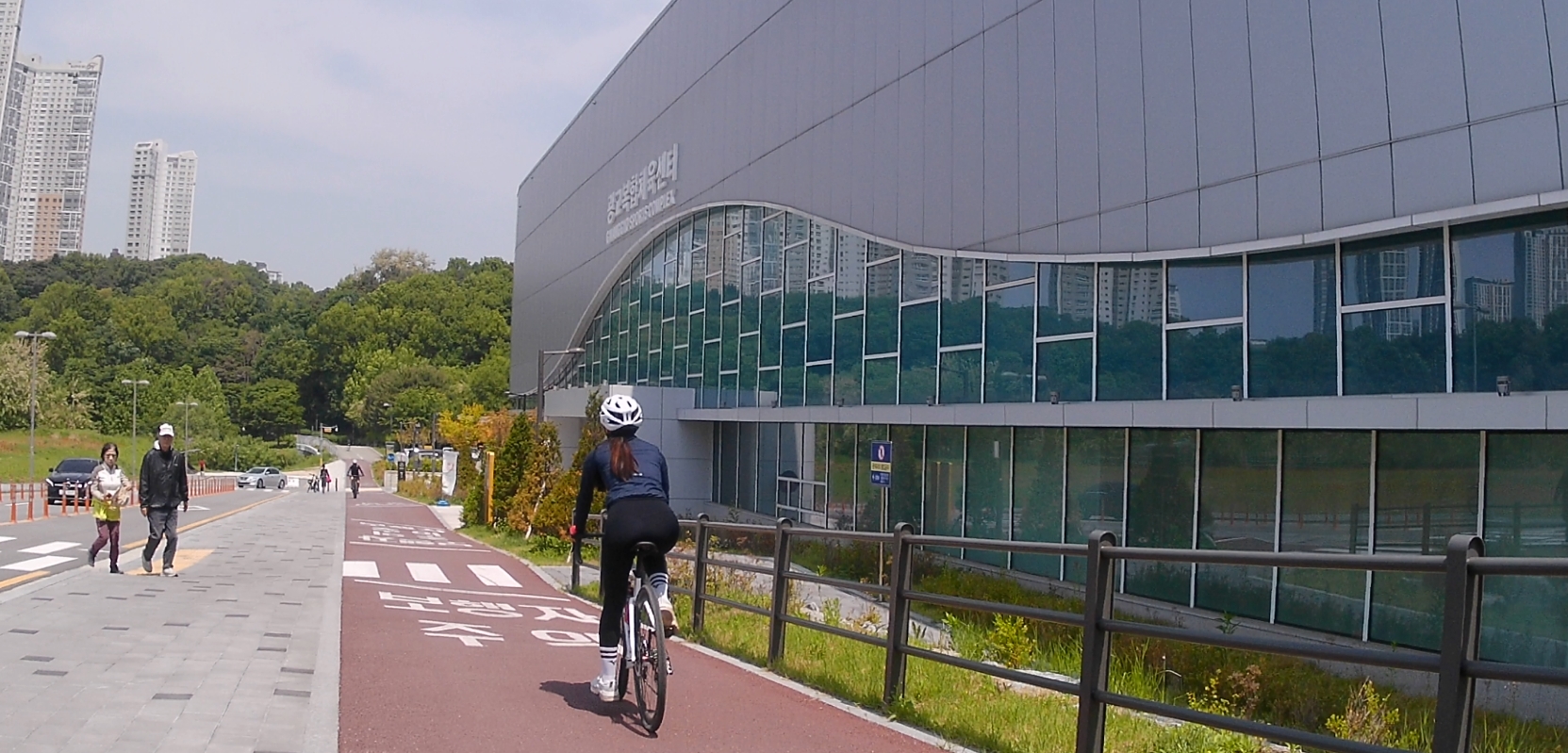 광교호수공원 내에는 자전거도로가 별도로 표시되어 있습니다. 산책로와 같이 있기 때문에 당연히 보행자를 주의하며 안전하게 타야합니다~