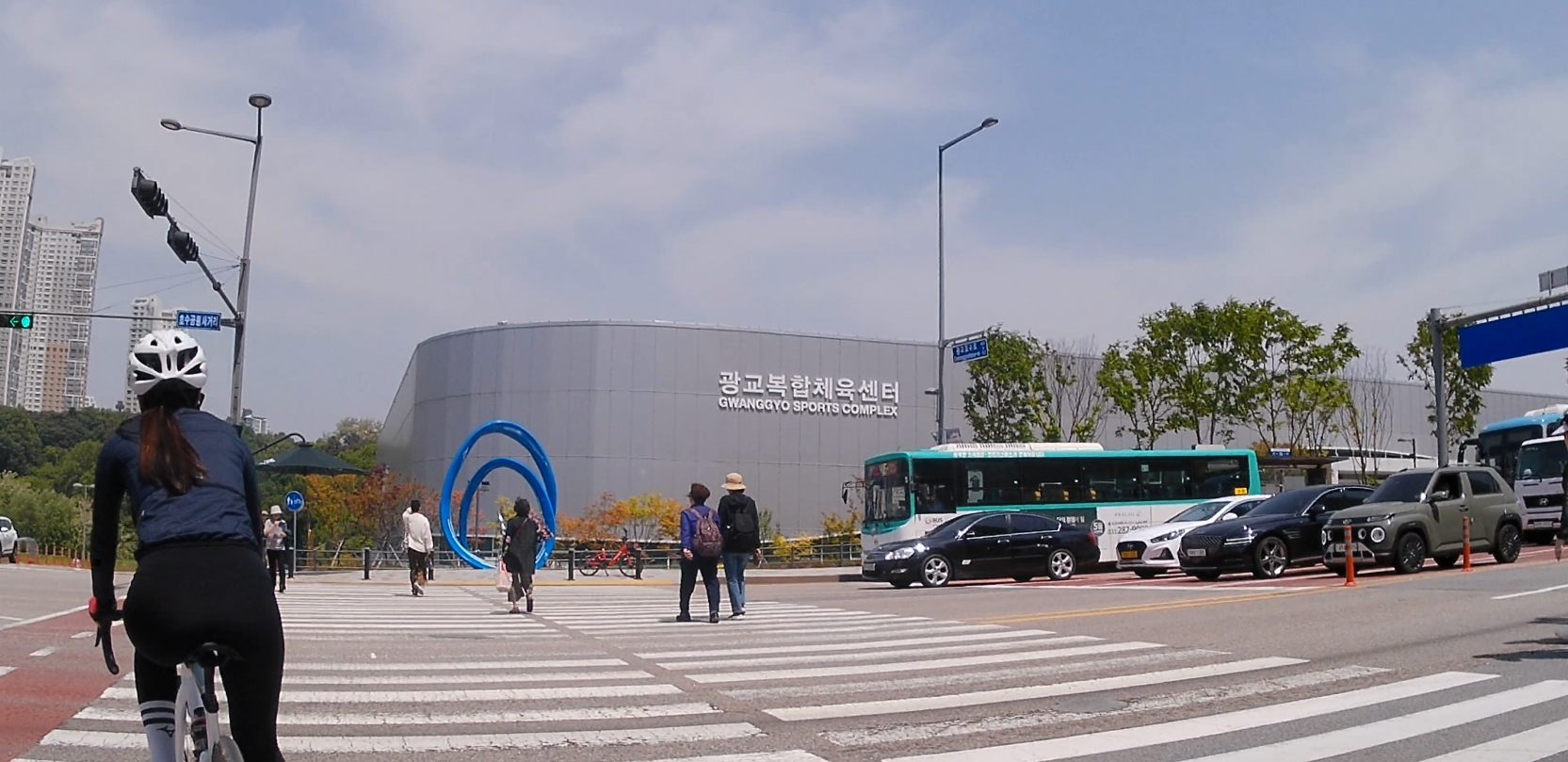 호수공원사거리에 도착하니 건너편에 광교복합체육센터가 보이네요. 건물 뒤쪽으로 광교호수공원이 있어요.