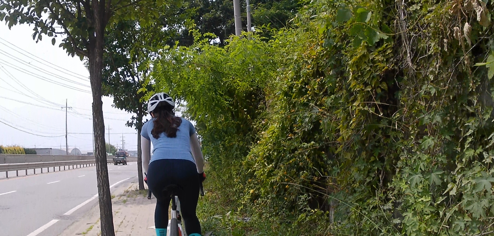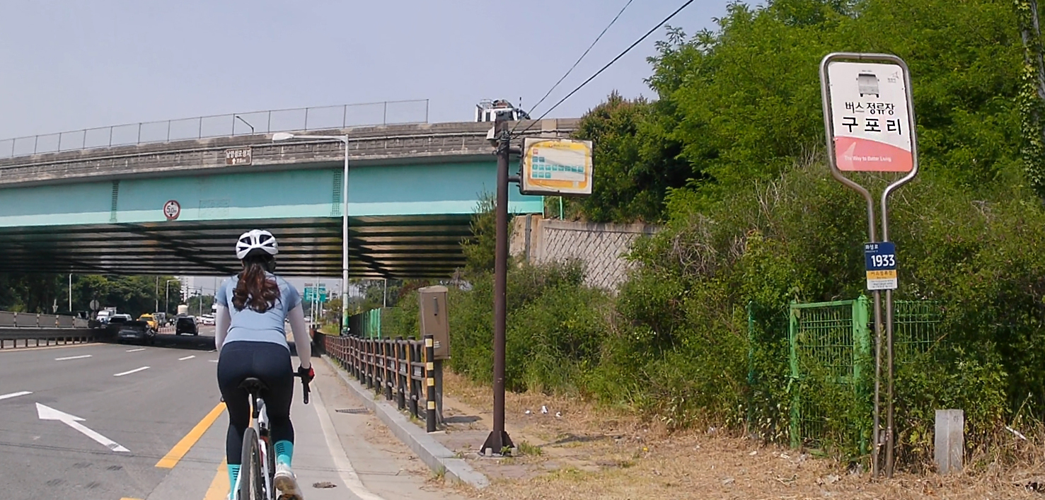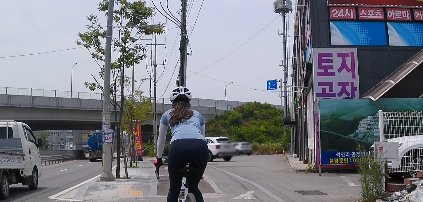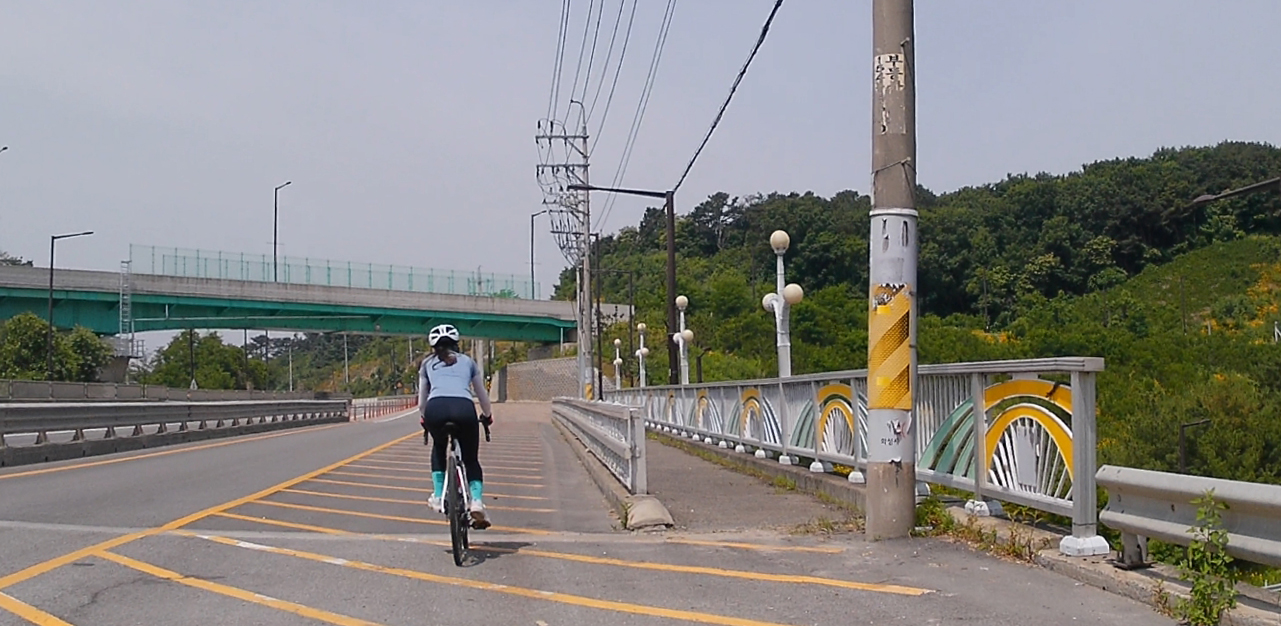 마도공단로부터 일부 구간은 자전거도로가 없습니다. 공도를 타기에는 차량들도 많고 무서워서 인도를 이용했는데요, 인도 중간에 가로수들이 심어져 있어서 이동이 수월하지는 않았습니다.
