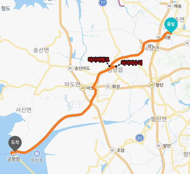 영종로 진입부터 궁평항까지의 거리는 약 14km 정도에요. 왼쪽으로 화성호를 끼고 달리는 풍경이 좋습니다. 하지만 비슷한 풍경이 이어지는 길이라 살짝 지루하게 느껴지는 구간이기도 합니다.