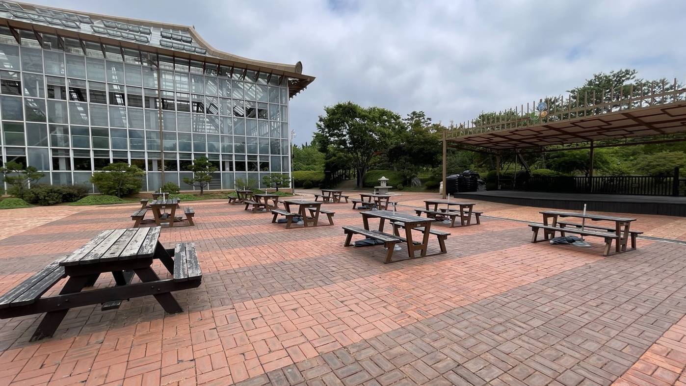 사계절 유리온실 앞에는 분수광장, 문화관광해설 안내소, 작은 카페 하나, 테이블이 놓인 쉼터가 있습니다.