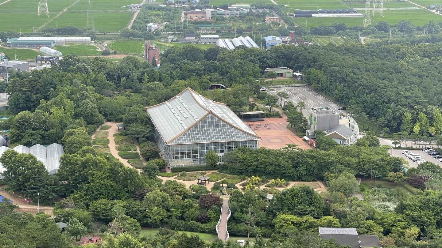 발 아래로 우리꽃식물원 전경과 근처 마을 모습이 한눈에 보입니다.