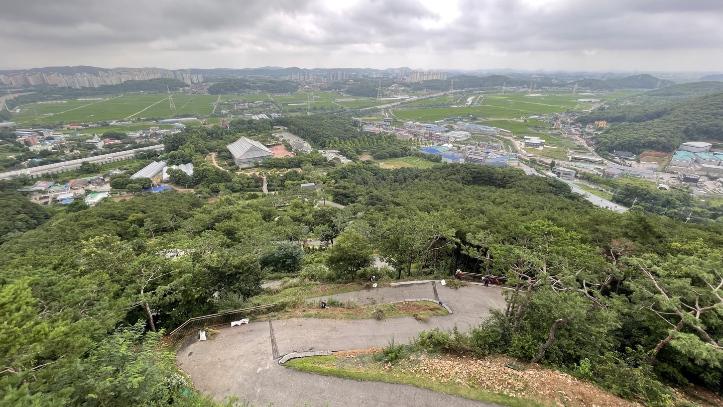 발 아래로 우리꽃식물원 전경과 근처 마을 모습이 한눈에 보입니다.