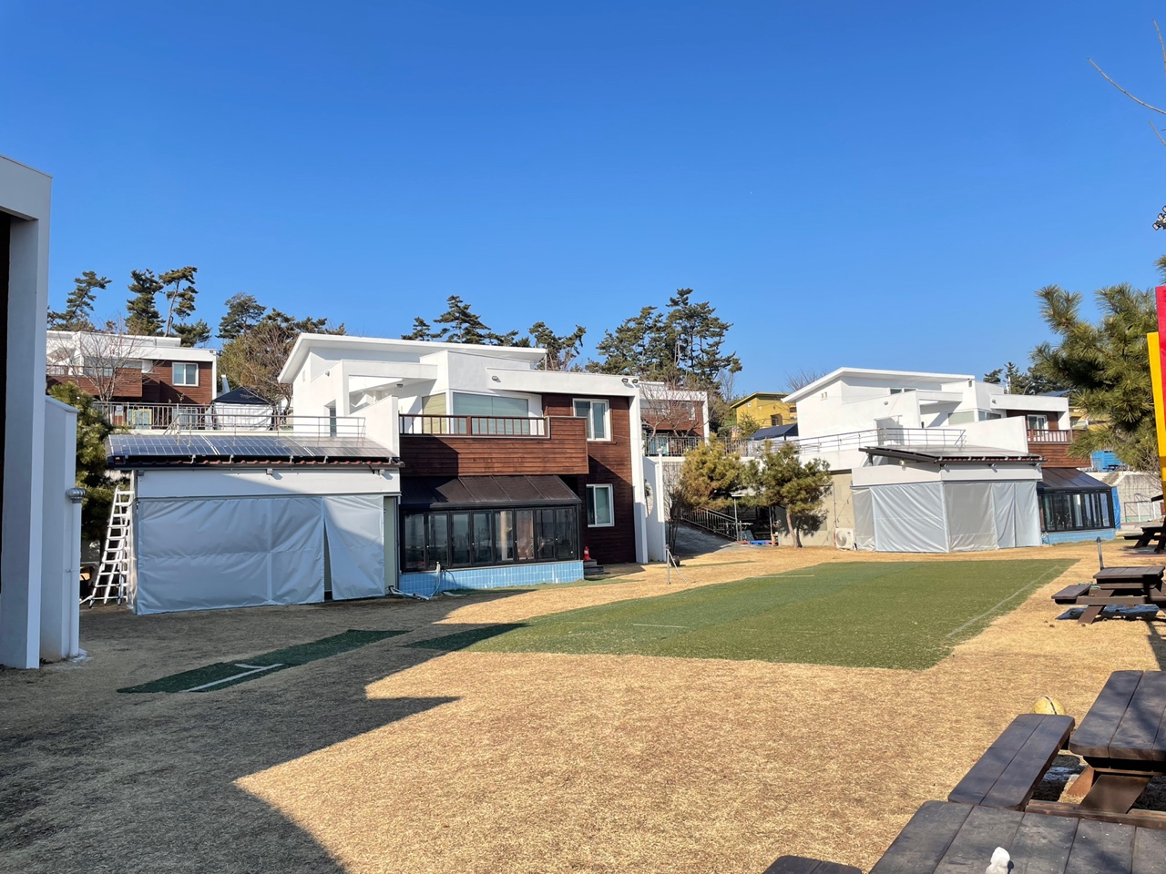 객실들 중앙에 있는 잔디밭이에요. 공놀이나 배드민턴 같은 야외활동을 즐길 수 있는 공간입니다.