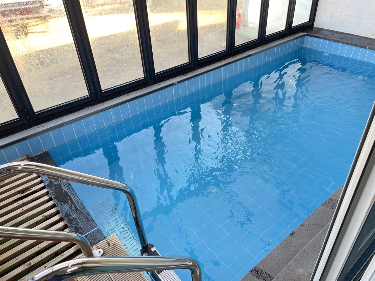 수영장에는 폴딩도어가 설치되어 있어 추위를 막아주고, 미온수 서비스로 따뜻한 물에서 수영을 즐길 수 있습니다.(미온수 서비스 비용 별도)