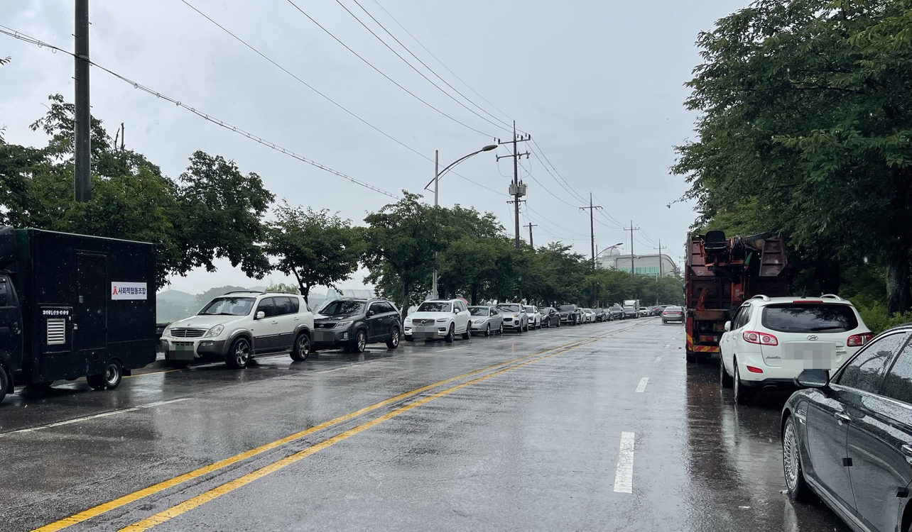 비가 많이 오는데도 주차 행렬이 길게 이어져 있었어요.