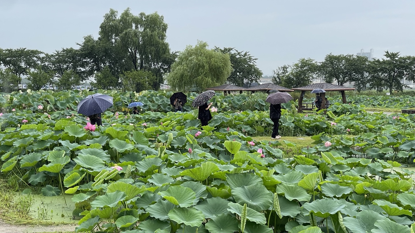 사실 비 오는 날이라 사람들이 거의 없을 줄 알았는데, 우산 들고 다니는 분들이 꽤 많았어요. 사진 찍으러 온 분들, 산책 나온 부부들까지. 연꽃 개화 시기엔 날씨 상관없이 찾는 분들이 많은가 봐요.