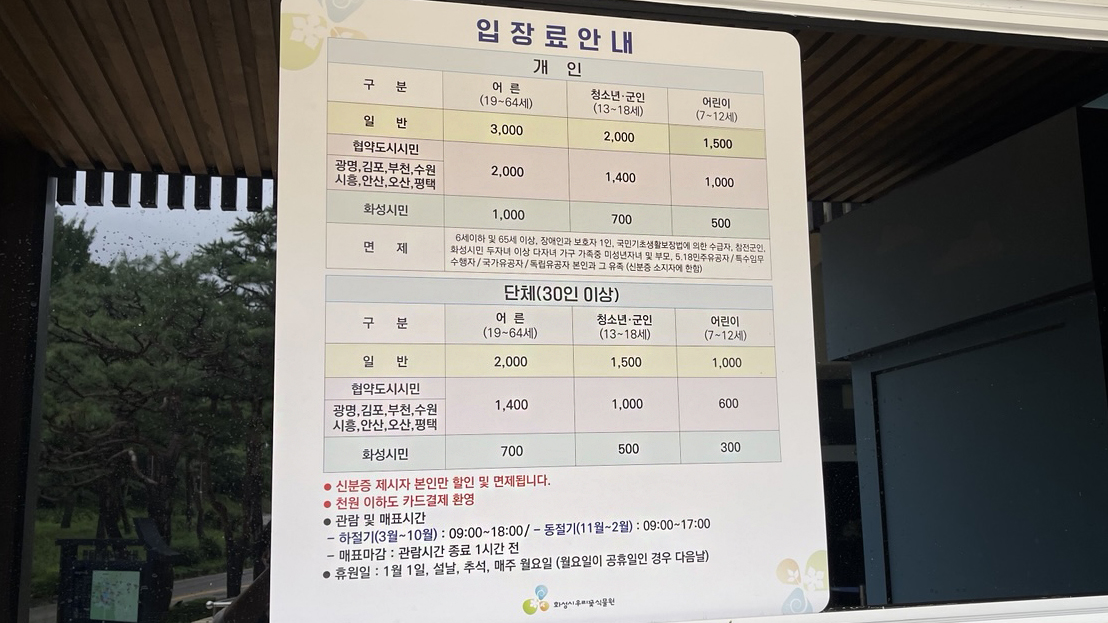 화성시민 할인: 어른 1,000원 / 청소년 700원 / 어린이 500원