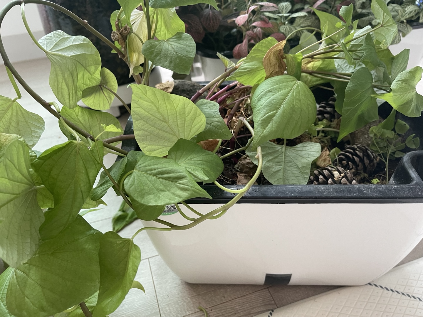 고구마잎은 실내에서 화분으로도 금방 자라기 때문에 키우는 재미는 있지만, 넝쿨이 무성하게 퍼지기 때문에 관리가 쉽지만은 않아요. 특히 고구마 뿌리를 수확하려면 넓은 공간과 충분한 햇빛, 깊은 흙이 필요한데, 화분에서는 어렵더라고요.