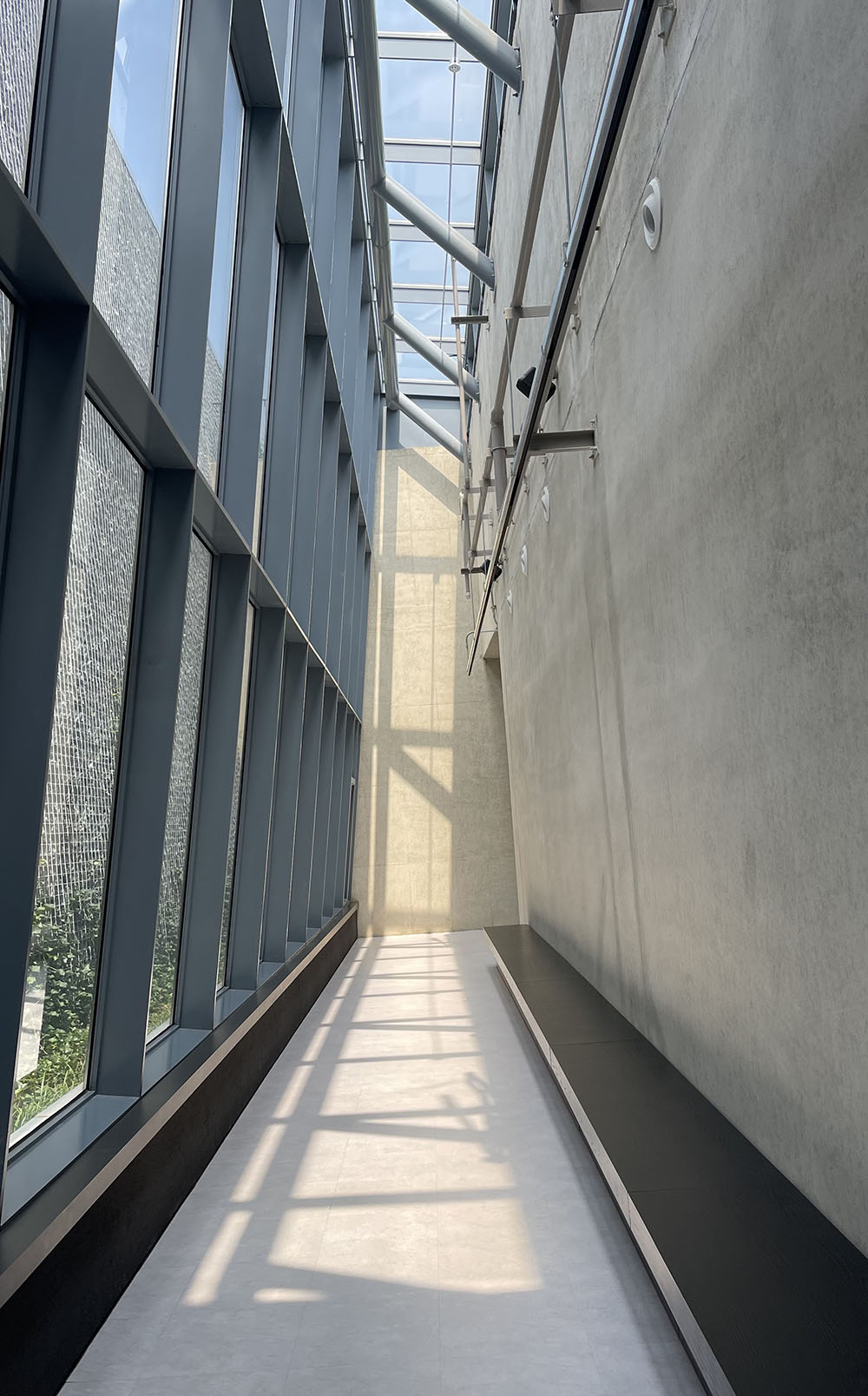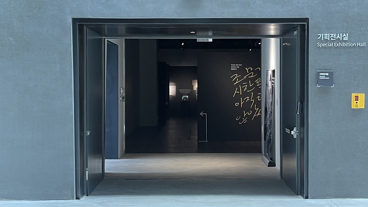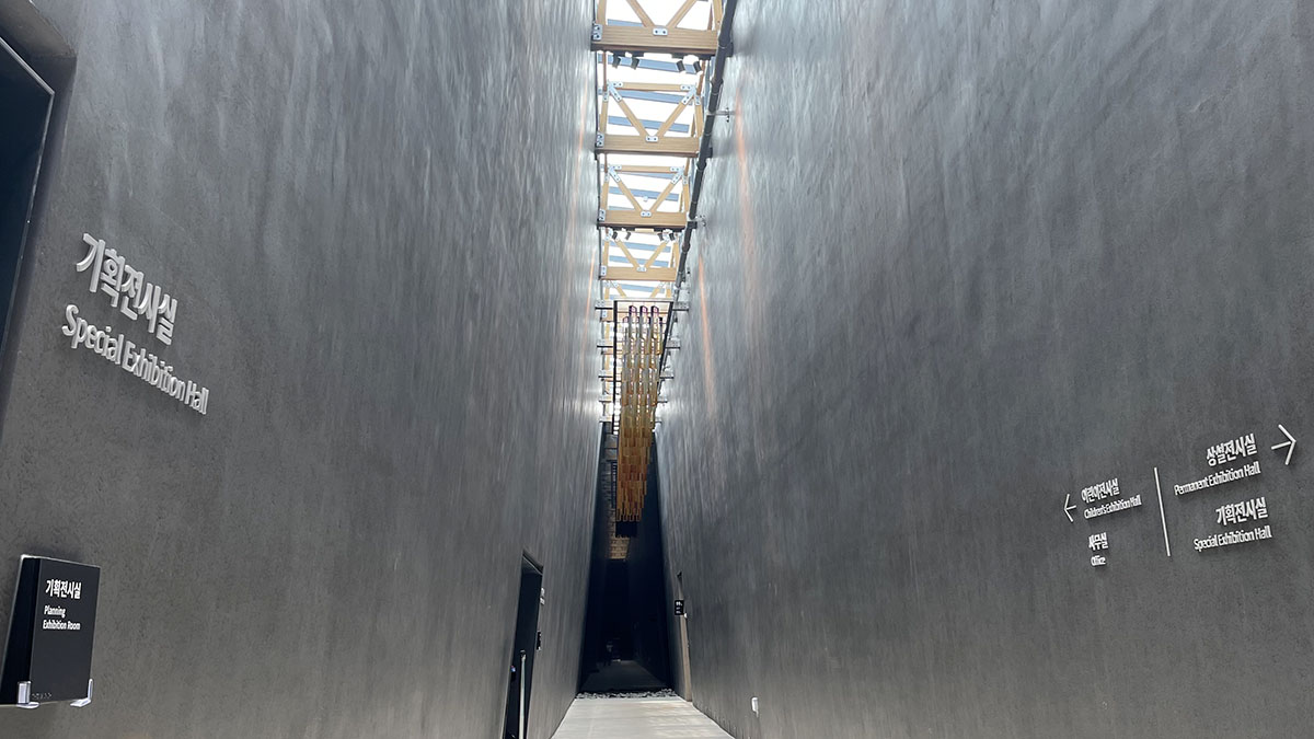 지하에 있는 내부 전시실은, 각 전시실로 향하는 경로에 ‘빛의 통로’라는 유리 천장이 있습니다. 유리 천장을 통해 밝은 빛이 스며들며, 과거의 어두움과 현재의 빛을 상징적으로 연결합니다.