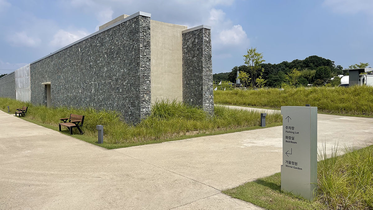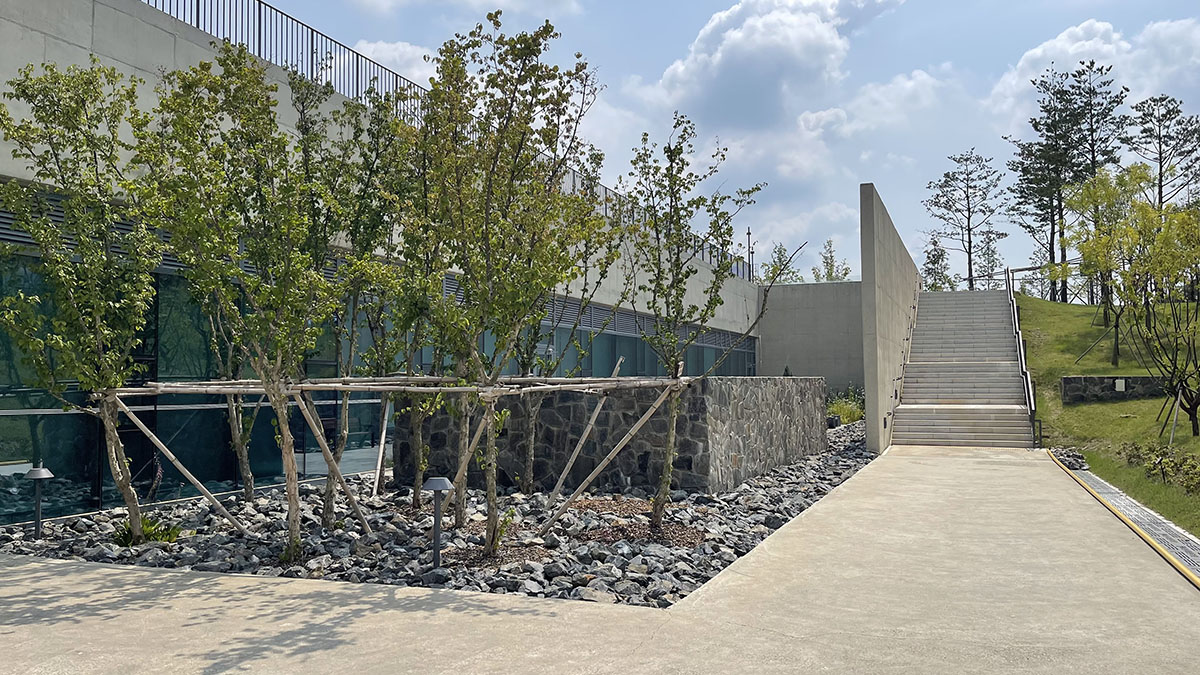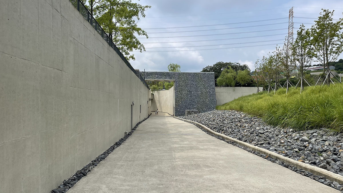 기념관은 지상에서 건물이 보이지 않는 구조이며, 외부에는 파쇄석을 활용한 통일된 벽체가 웅장한 분위기를 조성합니다.