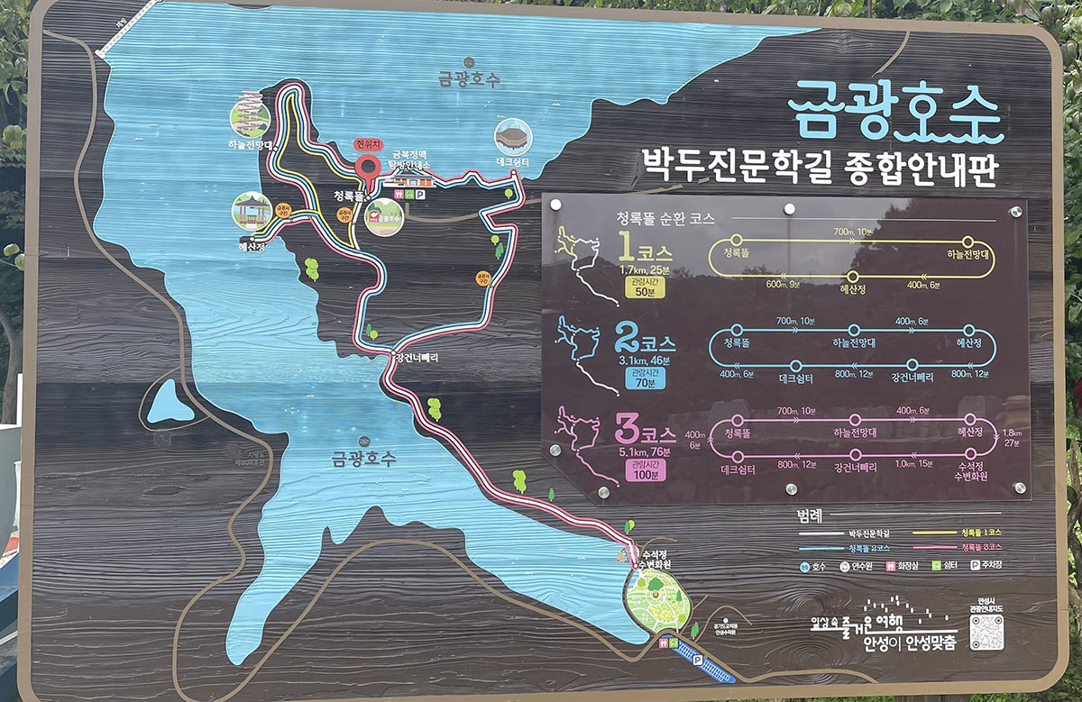 탁 트인 조망의 하늘전망대와 잔잔한 박두진 둘레길. 자연과 문학이 겹쳐지는 금광호수는 일상에 쉼표를 찍어주는 산책 코스였습니다. 다음엔 노을 시간을 맞춰 다시 찾고 싶어지는 곳이에요. 안성의 힐링 산책 코스로 추천합니다.
