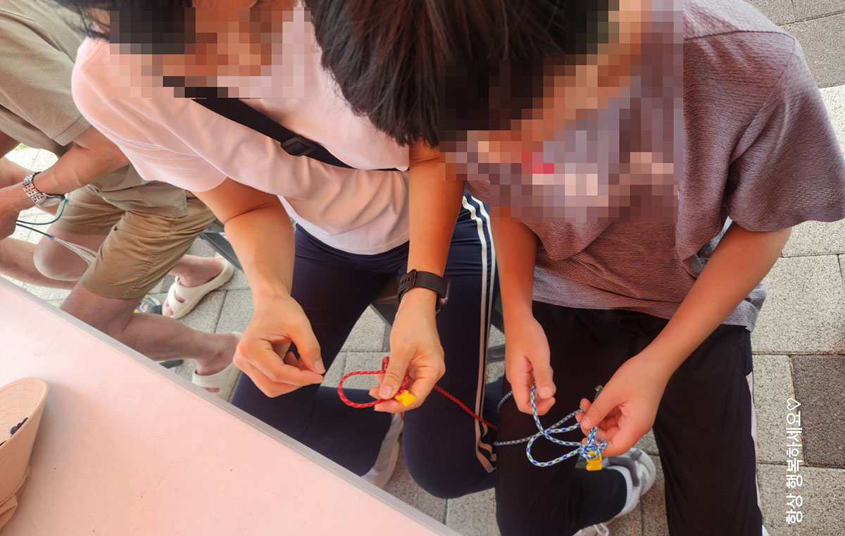 강사님의 안내에 따라 줄을 접고, 매듭을 엮는 패턴을 반복하다 보니 집중하게 되고, 어느새 작은 성취감도 느껴졌습니다. 매듭이 조금 헷갈릴 때도 있었지만, 완성품을 손목에 찼을 때의 뿌듯함은 정말 크더군요.