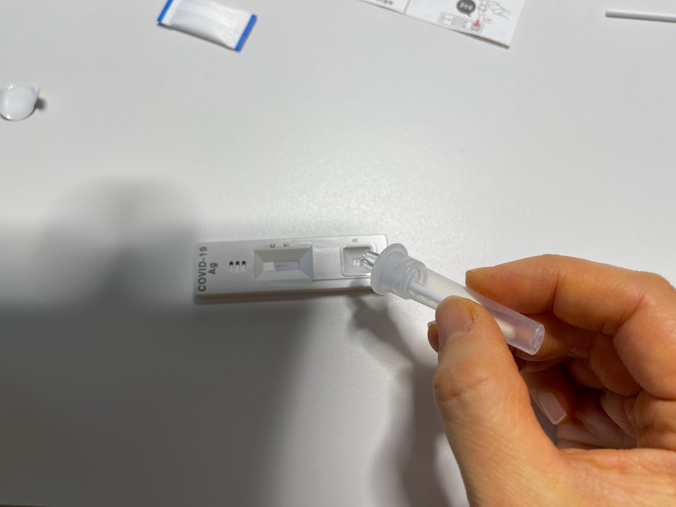 마지막에 면봉을 잘라 시약 용기 안에 넣고 마개를 닫은 후, 시약 용기를 10회 정도 상하가 뒤집히게 부드럽게 돌려 줍니다.
