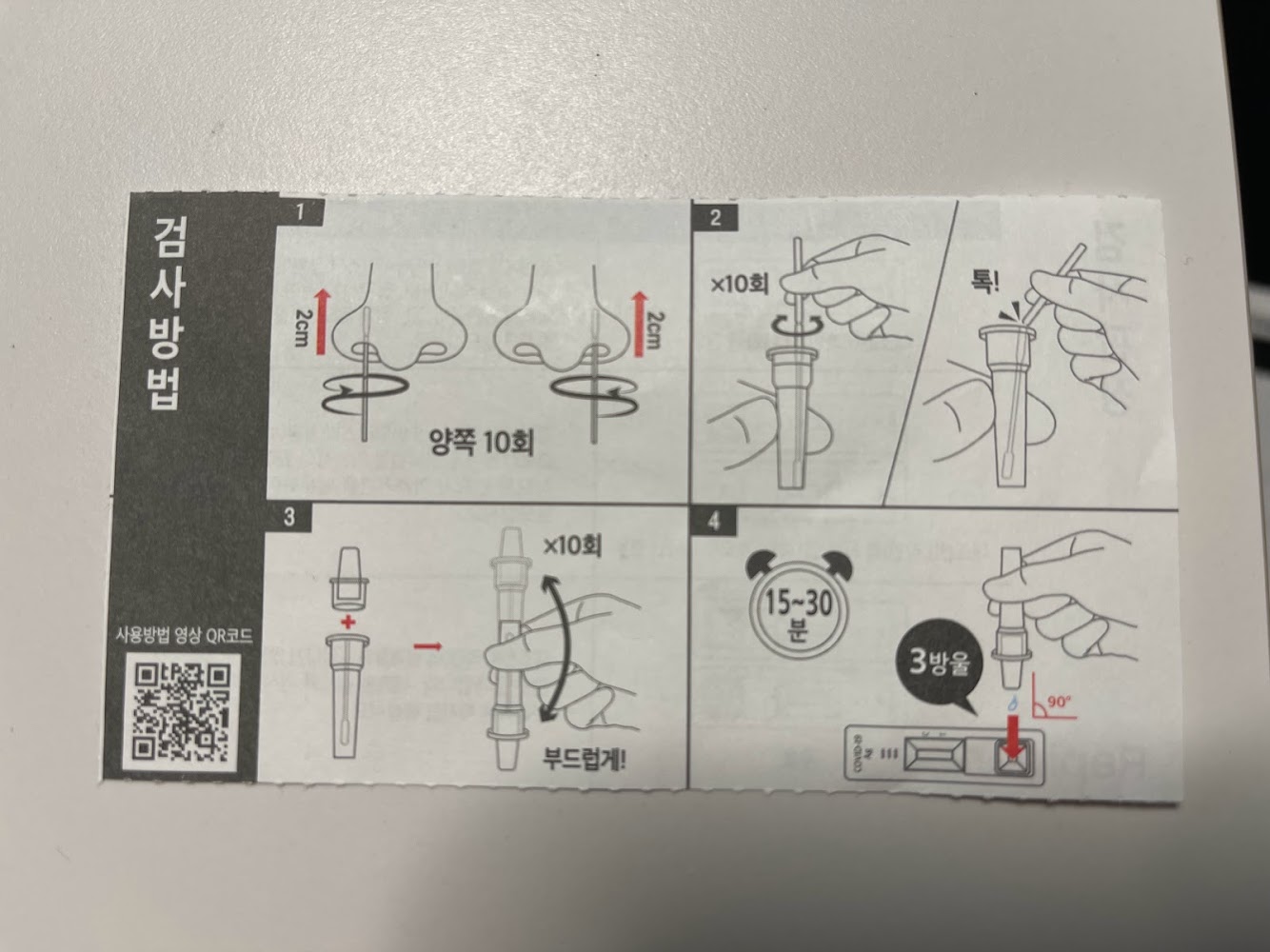 설명서에 나와있듯이 면봉을 코속 2cm정도 깊이로 넣은 뒤 10회 정도 돌려 검체를 체취합니다.