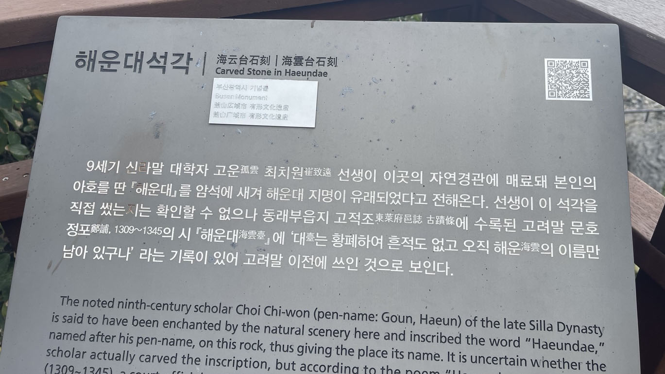 예로부터 시인과 묵객들이 즐겨 찾던 곳으로, 최치원 선생이 이 절경에 감탄해 ‘해운대(海雲臺)’라는 이름을 남겼다고 전해집니다. 지금도 산책로를 걷다 보면 '최치원의 각자(刻字)'와 동상, 시비가 곳곳에 세워져 있어 역사의 한가운데 있는 느낌이 듭니다.