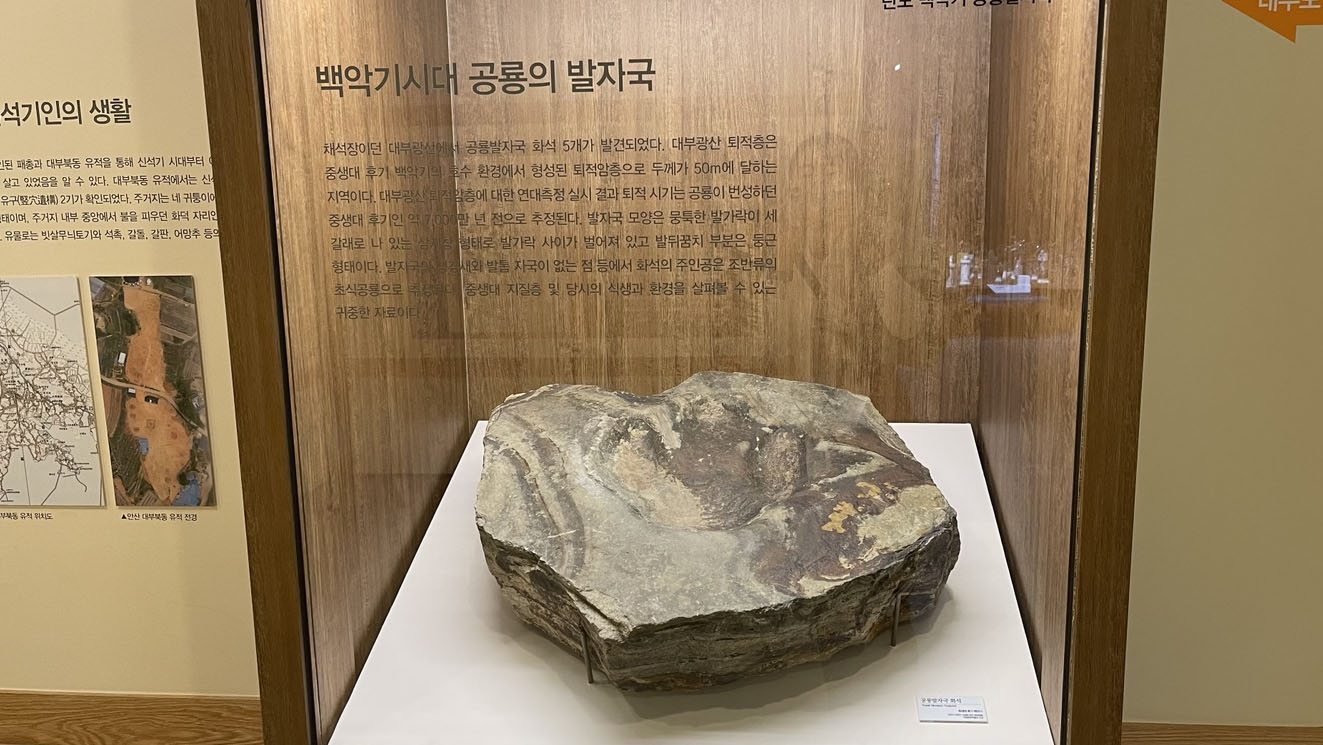 - 대부도 지역에서 발견된 공룡발자국 화석, 신석기시대 주거지 유물 등이 소개돼 있어요.