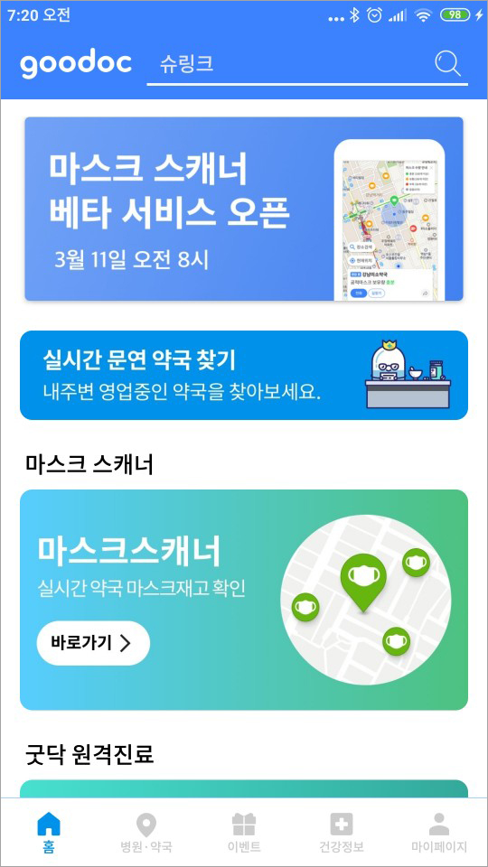 제가 사용해 본 앱은 '굿닥'이라는 앱인데요, 기존에 병의원이나 약국 관련 정보를 서비스하던 앱으로 보여지네요.