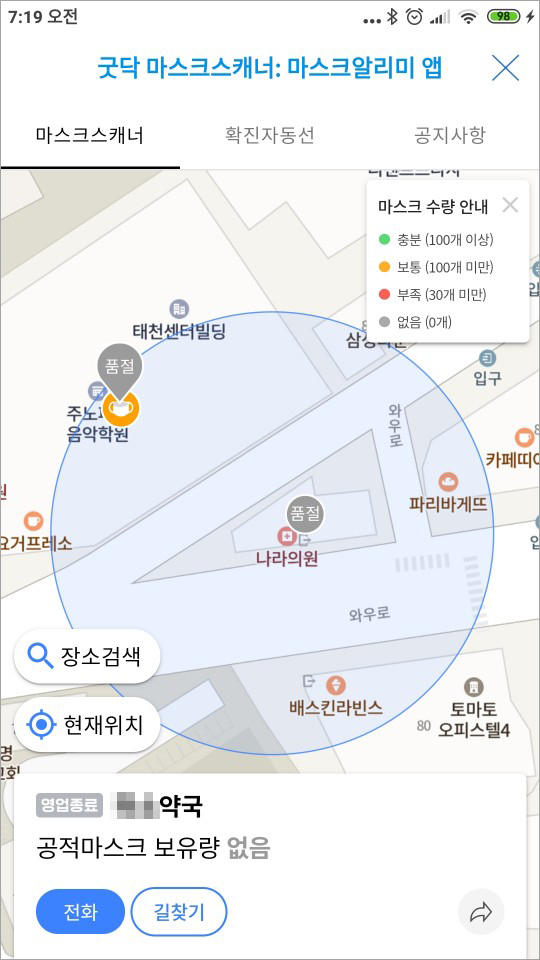 마스크스캐너 공지사항 < 정부의 공적마스크 데이터 개방과 관련된 공지 > 1. 3월 14일까지는 안정적인 서비스 운영을 위한 베타 서비스 기간으로 실제 현장 재고량과 차이가 있을 수 있습니다. |